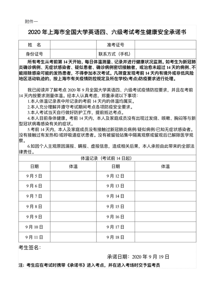各位考生:2020年上半年全国大学英语四、六级考试延考将于9月19日举行。根据本次考试防疫工作方案,作如下提醒:1.9月5日前,考生须在微信或支付宝完成本人“随申码”注册,同时下载打印《考生健康安全承诺书》(以下简称《承诺书》)(附件一),做好备考期间个人日常防护和健康监测,按要求如实、完整填写《承诺书》相关信息和健康数据并签字确认,考生对《承诺书》真实性负法律责任。2.如考生考前14天在沪或已到沪,建议非必要不离沪。考前14天内有境外或非低风险地区活动轨迹的,按上海市疫情防控最新规定及学校防疫要求处理。不具备考试条件的考生不得参加本次考试。3.考生在考前14天内如有发热、咳嗽、咽痛、呼吸困难、呕吐、腹泻等症状,应按规定及时就医。考前14天内出现体温≥37.3℃症状的考生,须持考前7天内新冠肺炎核酸检测阴性报告作为考试当日入场凭证。4.考试当日,考生于8点20分提前到达考场区域,预留足够时间配合考点工作人员进行入场核验。考生须自备口罩,除进入考场核验身份时须按要求摘戴口罩外,进出考点、考场应当全程佩戴口罩。考试过程中考生自主决定是否佩戴口罩。5.考生入场必须持当日更新的本人“随申码”绿