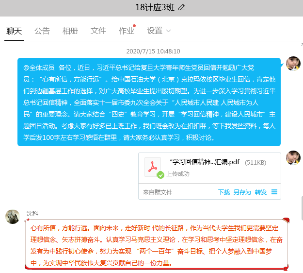 近日,习近平总书记给复旦大学青年师生党员回信并勉励广大党员:“心有所信,方能行远”。给中国石油大学(北京)克拉玛依校区毕业生回信,肯定他们到边疆基层工作的选择,对广大高校毕业生提出殷切期望。7月15日为进一步深入学习贯彻习近平总书记回信精神,全面落实十一届市委九次全会关于“人民城市人民建人民城市为人民”的重要理念。18计应、物联网班结合班级大部分同学已实习工作等实际情况与“四史”教育学习,在各自班级QQ群开展“学习回信精神,建设人民城市”主题团日活动。通过学习,引导大家正确认识时代责任和历史使命,激励了学生自觉把个人理想追求融入国家和民族的事业中,大家积极发言,交流心得体会,励志成为有责任有担当的有为青年。学习感悟18计应1张玉飞:我们要遵循习近平总书记说的方针“心有所信,方能行远”。面向未来,走好新时代的长征路,我们更需要坚定理想信念、矢志拼搏奋斗。在奋发有为中践行初心使命,努力为实现“两个一百年”奋斗目标、实现中华民族伟大复兴的中国梦贡献智慧和力量。18计应2曹琰斌:人民城市人民建,人民城市为人民。从古至今中国的发展都离不开底层人民的努力,无论是知识还是力量,正如习近平总书记所说的