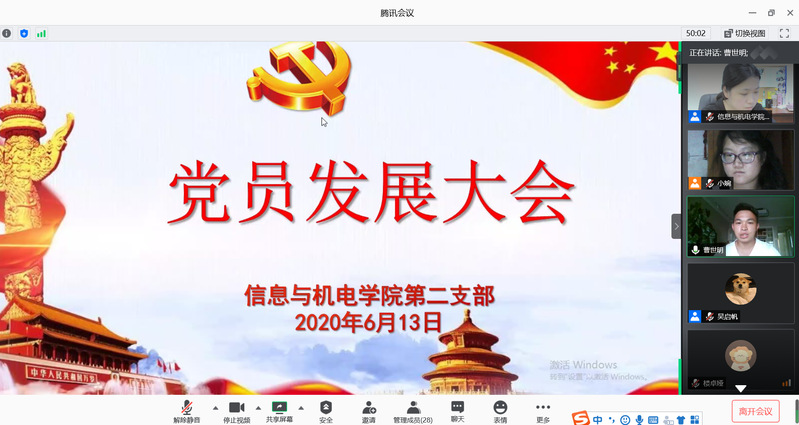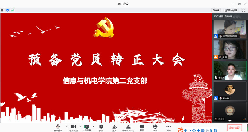 2020年6月13日21:00在腾讯会议召开了信息与机电学院第二党支部预备党员转正会议。会议由党支部书记胡婉君主持,支部与会的中共正式党员15名。会议严格按照组织程序进行。首先,由申请转正的预备党员左发永、李琪琪志、曹世明、贾达焦4位同志依次宣读自己的转正申请,分别详细汇报了各自在预备期间的表现,表达了入党的志愿和决心,并对自己在作为一名预备党员期间,在思想、学习和工作上的进步与不足作了认真的总结。左发永其次,支部党员对4名同志的思想认识及表现情况进行了评价。大家一致认为,左发永、李琪琪、曹世明、贾达焦同志在预备考察期间,严格要求自己、积极参与党组织的各项活动、及时向党组织汇报自己的思想情况,工作积极、踏实肯干、模范带头作用突出。曹世明再次,全体与会党员进行了匿名表决,一致通过,左发永、李琪琪、曹世明、贾达焦同志如期转为正式党员,报上级党组织审批。相信新时代新党员一定会成为党的新生力量,为党和人民做出自己应有的贡献,接着此次按期转正的4位同志依次表态,表示今后将更加严格要求自己,争做一名合格的共产党员。李琪琪最后,信息与机电学院党总支书记刘群同志、信息与机电学院第二党支部书记胡婉君同志
