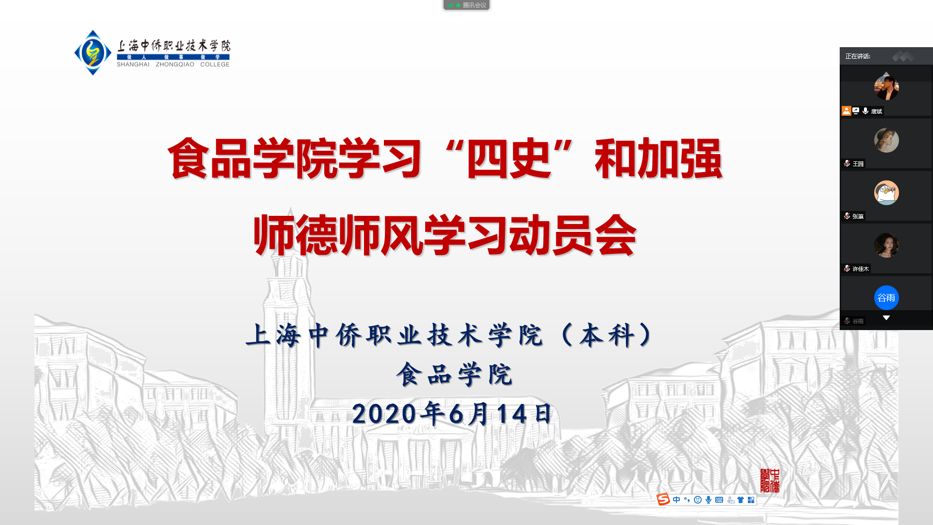 6月14日,食品学院以视频会议的形式召开了有关党史、新中国史、改革开放史、社会主义发展史的学习教育。并对即将开展的师风师德培训进行学习动员。会议由食品学院直属党支部书记唐斌主持,参加培训的教师参会。为深入学习习近平总书记关于教育的重要论述和全国教育大会精神,加强教师对“四史”的学习,厚植爱国情怀,进一步提升师德素养,推动我校师德建设常态化长效化,学校组织教师参加由中国教育干部网络学院组织实施的“厚植爱国情怀涵育高尚师德,加强新时代教师队伍建设”专题网络培训。对此食品学院也对参训教师进行了学习动员,唐斌书记强调了培养优秀师德师风的重要性,要求各位教师严肃认真参训,吴酉芝院长也对各位参训教师提出认真看待,积极学习的学习要求。