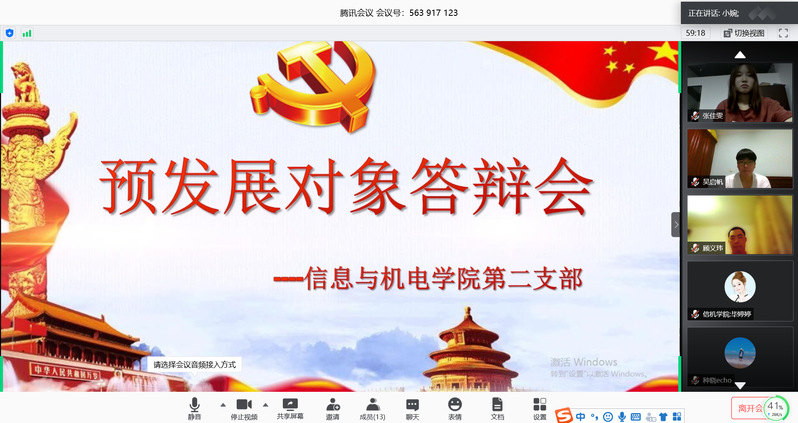 为了扩充党支部队伍,吸纳信仰坚定、表现突出、甘于奉献、勇于担当的优秀学生加入党组织,信息与机电学院第二党支部于2020年5月29日19:00通过腾讯会议举行线上确定发展对象答辩会。支委会成员一起听了7名同学们的答辩。召开发展对象答辩会是党建工作把好党员入口关的重要环节之一,要求参加答辩的同学对党的基本知识进行全面了解。支部书记胡婉君老师首先对即将答辩的同学讲解了在答辩过程中的要求与一些注意的问题:“发展对象答辩是一件很严肃的事情,各位同学需认真对待,我们支部所有党员老师都参与了这次答辩,就是为了展示我党的公平公正公开。现在在场的同学,都是优中选优,经历了初党、中党和高党的学习,一步步走到今天,我希望你们对自己负责。在答辩过程中,同学们认真汇报了自己被列为入党积极分子以来的思想、学习和工作情况,全面剖析了自身的优缺点,并就党的知识、入党动机、政治思想、现实表现及入党后的打算等提问作了现场答辩。答辩中,他们表现出了较高的综合素质和较好的口头表达能力,自我剖析及问题答辩也具有一定的思想理论水平,支部党员也在认真听取并随时做着记录,答辩结束后,其他党针对党章与时事政治对答辩对象进行了提问,也提