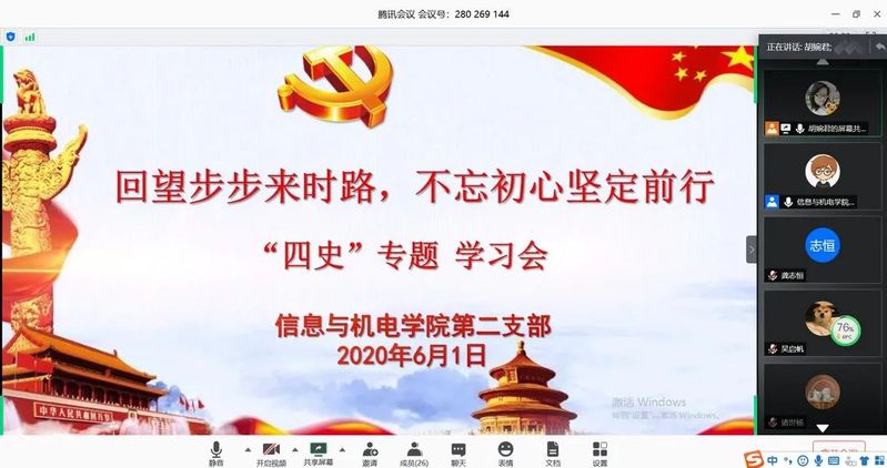 根据校党委“四史”学习教育工作部署,为加强对党员和发展对象的“四史”教育,信息与机电学院第二党支部围绕“四史”学习内容要求于2020年6月1日18:30通过腾讯会议开展了主题为《回望步步来时路,不忘初心坚定前行》的线上专题学习会。全体党员、发展对象一起学习,会议由党支部书记胡婉君老师主持。首先,胡老师讲到:“四史”,是党员干部的一门必修课。修好这门必修课,不是无的放矢,而有明确的目标指向。上海市委“四史”学习教育领导小组会议指出,“要把‘四史’学习教育与做好当前工作紧密结合起来。从历史中汲取精神力量、汲取经验智慧、汲取坚守人民立场的定力,努力克服疫情影响,坚定不移做好自己的事情,更好推动改革开放再出发,更好增进人民群众福祉。”她希望大家无论在学习、生活、工作中,不要忘记学习,不忘初心坚定前行。其次,胡老师给大家播放学习视频--“1921点亮中国”,通过这个视频反映了建党历程,反映了共产党如何建立、时代背景、历史渊源等问题。全体党员重温了党的奋斗历史和光辉历程,感悟了不同历史时期优秀共产党人“不忘初心、牢记使命”的求索与奋斗历史,党员们深受感动。随后,刘群老师带领大家一起学习了《中国共产