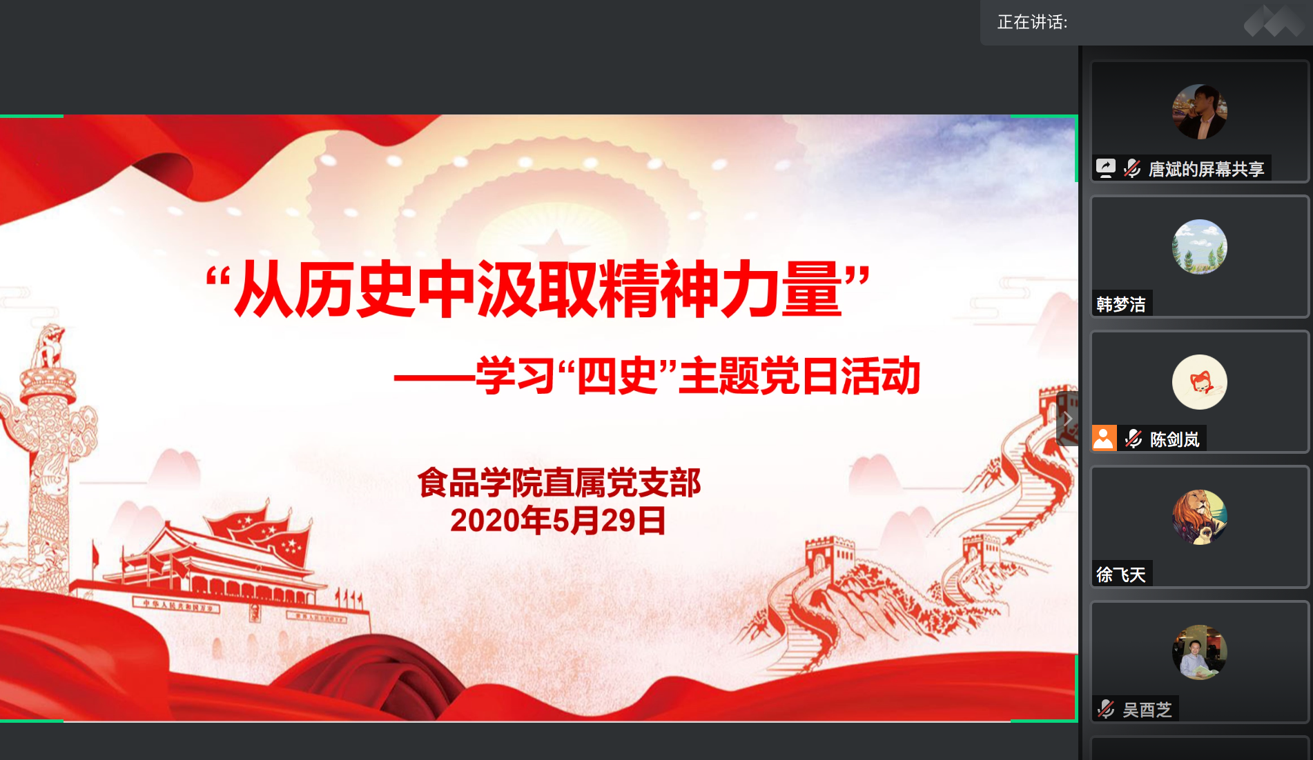 5月29日15点食品学院直属党支部在腾讯会议开展了“从历史中汲取精神力量”为主题的线上主题党日活动。出席本次活动的有党支部全体党员和入党积极分子。国旗、国徽、国歌是我们伟大祖国的重要形象,是我们用无数艰苦卓绝、流血牺牲所换来的国家政权的标志。食品学院直属党支部书记唐斌老师对国旗、国徽进行讲解并通过学习强国平台带领支部党员、入党积极分子一同观看《中华人民共和国国旗的诞生》与《中华人民共和国国徽的诞生》,全体党员、入党积极分子认识到从中国共产党的诞生到取得新民主主义革命胜利,建立了人民当家做主的新中国,这国徽,国旗和国歌来之不易,现在这美好生活的一切正是因为中国共产党人始终坚守崇高而坚定的理想信念,牢记自己的初心和使命,铭记历史,发扬不畏艰险,顽强奋斗,无私奉献的精神,为中华民族伟大复兴的中国梦贡献自己的一份力量。入党积极分子感言:通过今天的学习,让我知道了我国宪法和法律规定,国旗、国徽、国歌是中华人民共和国的标志和象征。国歌国徽国旗应当常记在国人心中,应成为中华儿女的精神寄托和骄傲自豪。从激发人们信心、凝聚人们信仰来讲,国旗、国徽、国歌是国家信念和力量的承载,是中华儿女求索进步的希冀,能