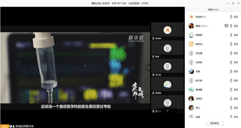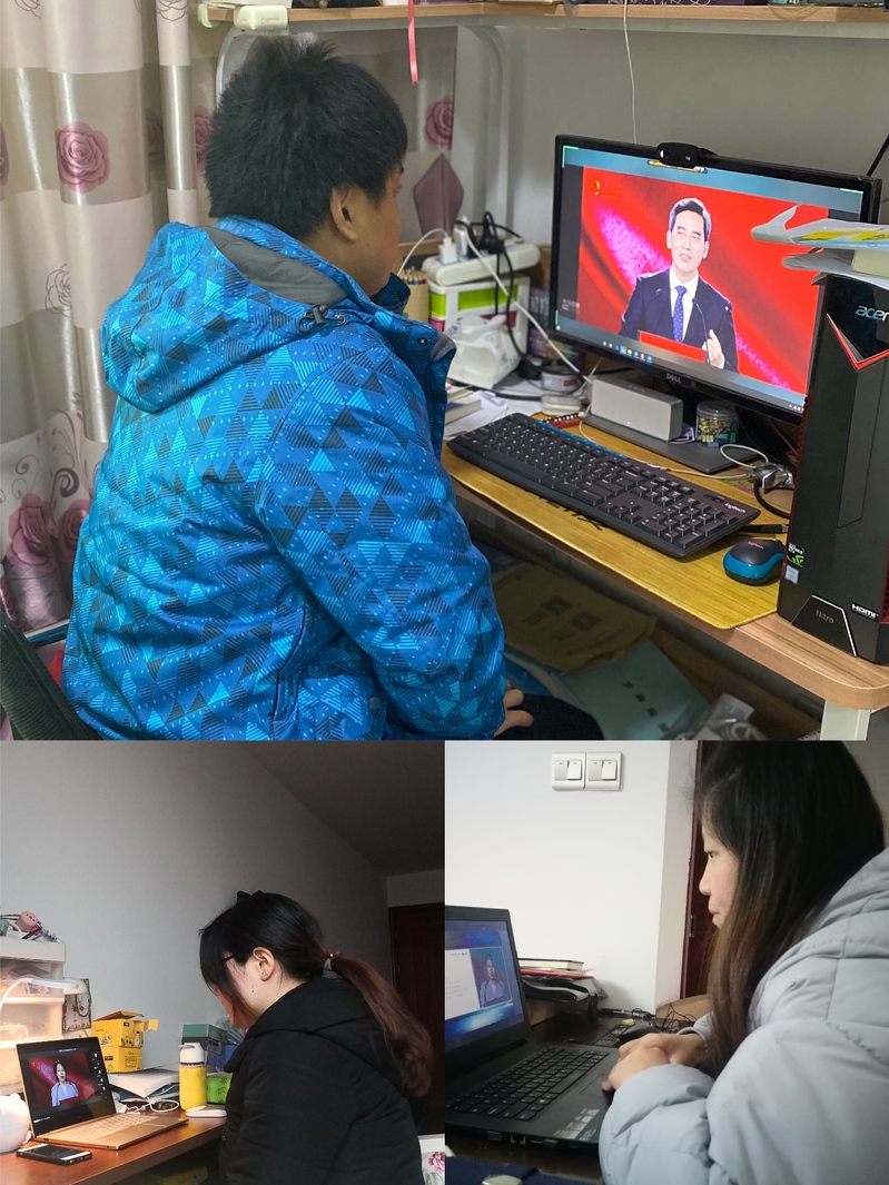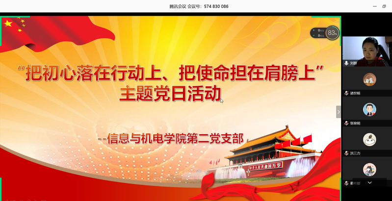 为进一步做好新冠肺炎疫情防控工作,充分发挥党支部政治核心和示范引领的作用,信息与机电学院第二党支部在2020年3月28日18:30利用腾讯会议开展了以“把初心落在行动上、把使命担在肩膀上”的主题党日活动,全体党员出席,一起认真学习习近平总书记重要讲话精神,谈思想、谈认识、谈体会、谈行动。此次会议由第一支部书记胡婉君老师主持。学习习近平总书记讲话精神首先,胡婉君老师通过PPT讲解带领大家集中学习了2月23日习近平总书记在统筹推进新冠肺炎疫情防控和经济社会发展工作部署会议上的讲话以及3月4日习近平总书记在中共中央政治局常务委员会会议讲话精神。习总书记在讲话中指出,当前疫情正处在关键阶段,统筹推进疫情防控和经济社会发展任务艰巨,要充分发挥党员的先锋模范作用。全体党员要毫不放松,抓紧抓实抓细疫情防控工作,进一步做好各方面工作。在这场大考中磨砺责任担当之勇、科学防控之智、统筹兼顾之谋、组织实施之能,做到守土有责、守土有方,为取得这场疫情防控人民战争、总体战、阻击战的最后胜利而不懈奋斗。观看视频随后,给大家认真观看了两段视频《大党担当》、《英雄不是从天而降,只因你我挺身而出》,视频中出现了许许多多