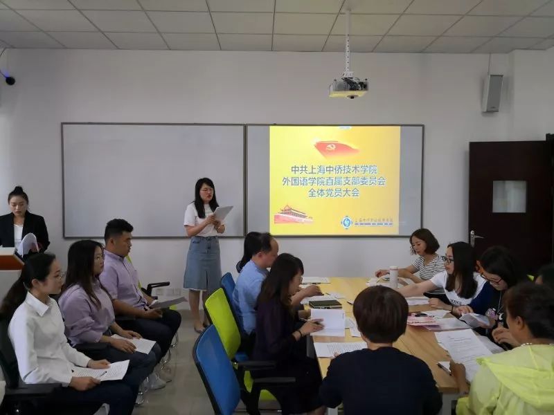 2019年6月14日中午,外国语学院直属支部委员会在2号楼206室召开全体党员大会。大会由外国语学院分辅导员梁文静老师主持。大会的第一项是集体学习:封晓莉书记首先安排全体党员参观“城市荣光———上海解放70周年主题展览”;接着大家集体学习了《中国共产党党员教育管理工作条例》;大会的第二项:讨论吸收施博闻、牟博、朱雯愉、刘梦圆四位同志为中共预备党员;第三项:讨论胡臻云和陈丽雲两位同志的预备党员转正事宜。上海中侨职业技术学院党委副书记管琰琰教授莅临本次会议。首先,四位同学依次上台做简短陈述,介绍自己从递交入党申请书以来在学习,工作、生活等方面的成长、进步和收获;入党介绍人和教师党员分别指出每位同学优点和不足,希望他们扬长避短,严于律己,做名副其实的中共党员。接着由预备党员胡臻云和陈丽雲同志宣读转正申请书,汇报了在预备期这一年期间的表现;教师党员分别指出了两位同学的优点优势以及努力方向。通过投票表决,应到14名,因培训和公事请假3人,全票一致通过,四位发展为中共预备党员;两位预备党员按期转正。管琰琰教授以及各位党支部的成员也对党组织新成员的加入表示了热烈的祝贺。此次会议严格按照各项程序有序进