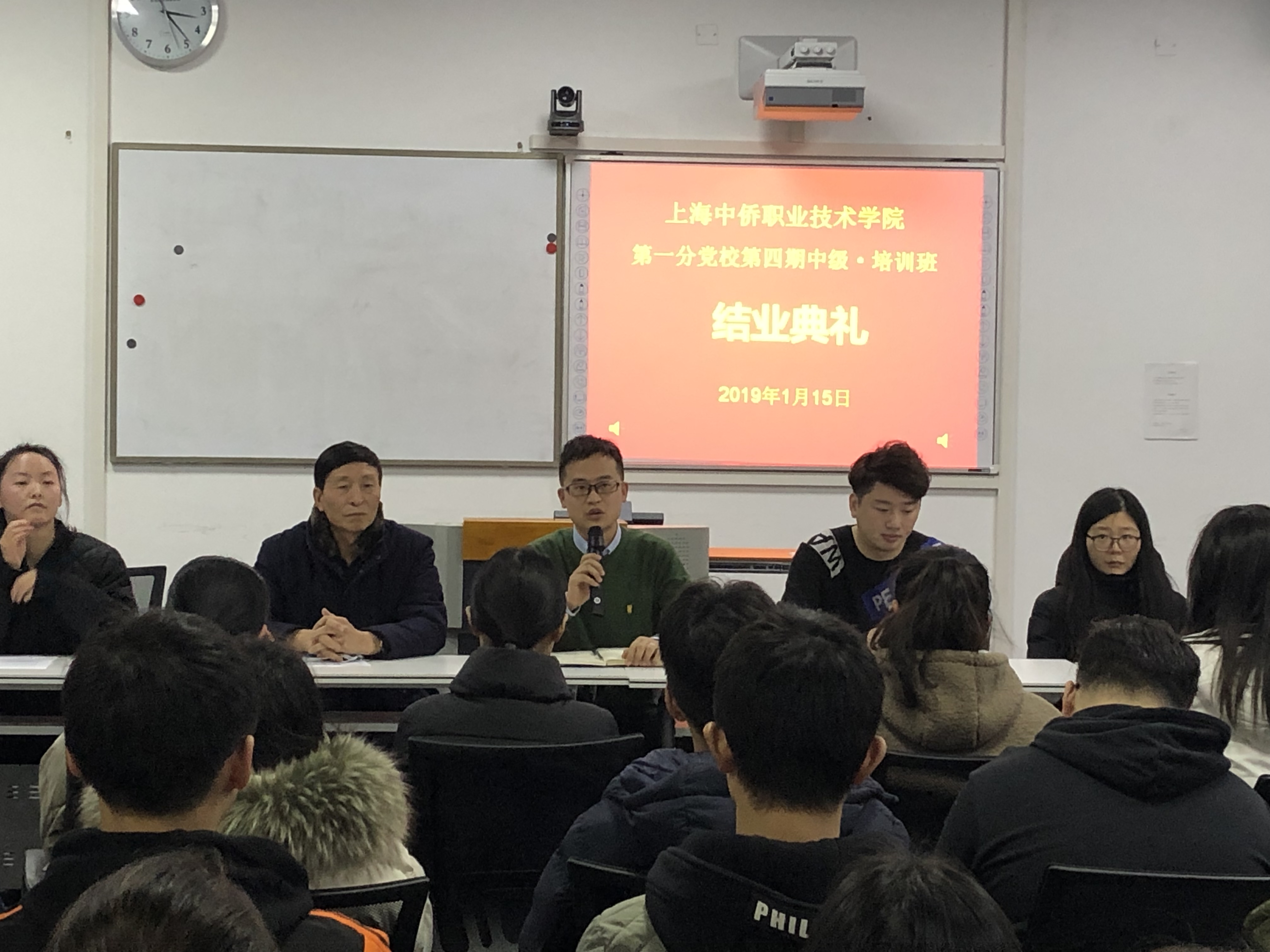 2019年1月15日下午3:45分,上海中侨职业技术学院第一分党校第四期中级培训班结业典礼在3号楼302教室举办。经济与管理学院党总支书记石成玉、党总支副书记郭骏、党总支纪律委员孙斌、党总支组织委员李玲、党总支宣传委员陈萍萍、第一党支部书记曹小玉、第一党支书组织委员邵静、第一党支部宣传委员曹珊珊、各年级辅导员以及全体通过中党的学员参加了此次结业典礼。本次结业典礼由第一党支部组织委员邵静老师主持,分三项内容。首先全体奏唱国歌,随后孙斌老师宣读了获得优秀学员名单,最后由石成玉书记对本次中党培训做了总结发言并从三方面对通过中党考试的同学提出要求和希望。第一,石书记祝贺了所有通过中党的同学,并希望同学们在培训之后能够继续加强理论学习,要秉持学无止境的精神;第二,石书记提出两个关键词“身份”、“律己”,希望通过中党的同学,谨记自己入党积极分子的身份,向党员标准看齐,记住自己的学生身份,以学习为主,增强责任感;第三,希望同学们要用实际行动来践行党员的先锋模范作用,不忘初心、牢记使命,积极为班级、学校和社会做贡献。此次中党培训班,参加总数为57人,顺利结业为55人,希望各位同学能够谨记老师们的要求和