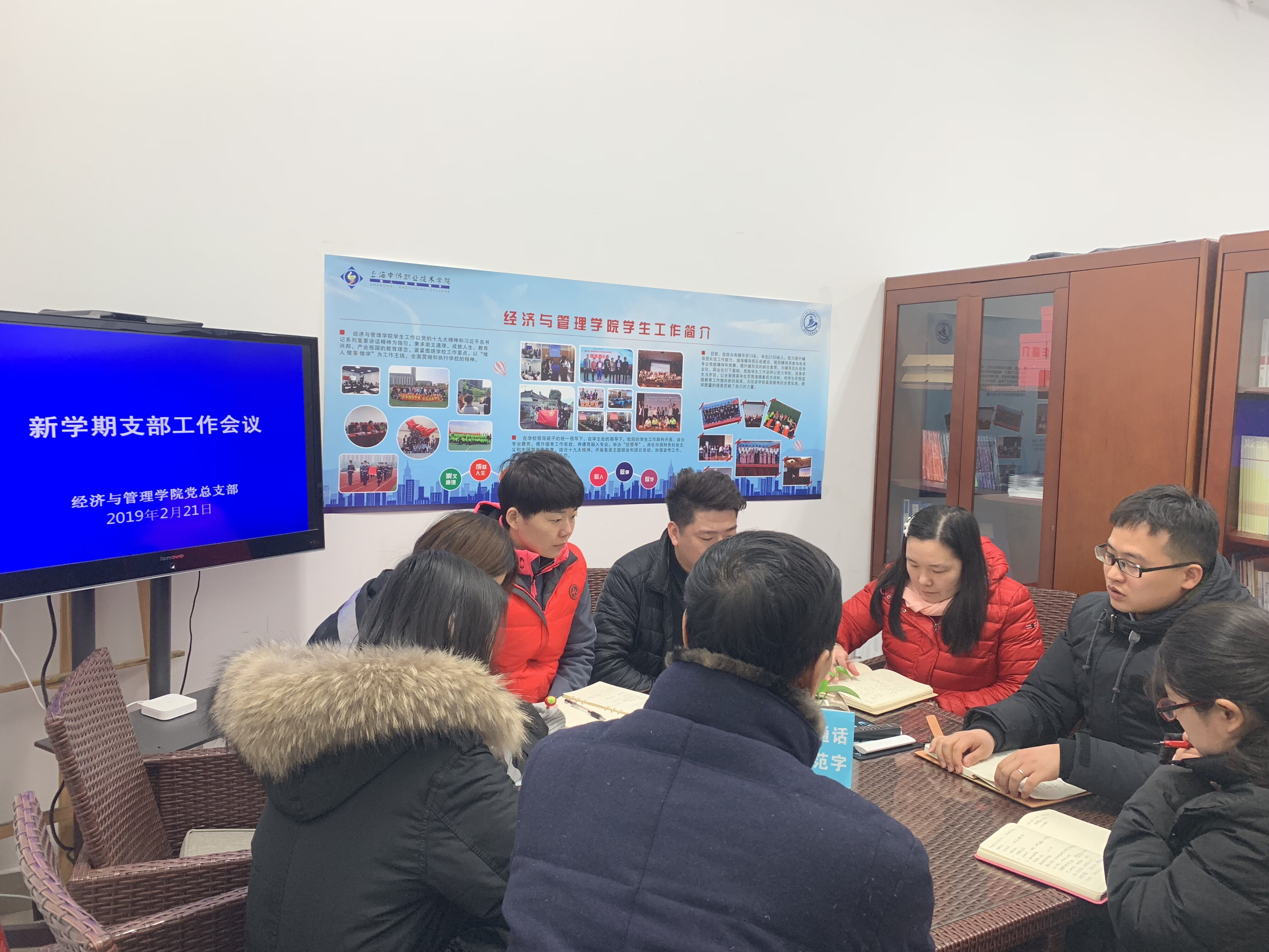 2019年2月21日上午10:30经济与管理学院在3号楼205召开了党总支部新学期工作会议。会议由党总支书记石成玉主持。党总支全部支委出席了会议。会议开始,石老师首先强调了意识形态工作对于高校的重要性,希望大家按照相关规定,把握好意识形态工作。接着石老师又就新学期支部的理论学习、党校培训、以及组织生活等工作做了具体的布置。通过此次会议,支部的支委们统一了思想,提高了认识,明确了工作,更好的保证了基层党支部的战斗堡垒作用。