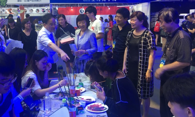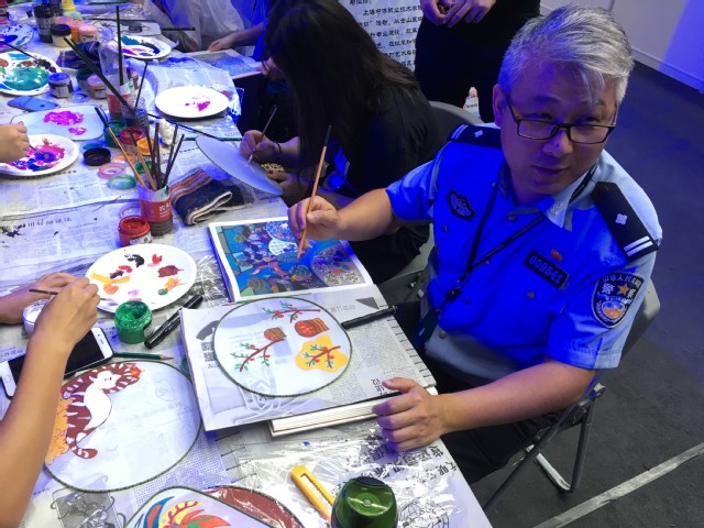 现场参观者络绎不绝,争相学画金山农民画,成为全场最热闹的展区。艺术系志愿者热情讲解金山农民画的色彩与造型特点。一位警察慕名前来学农民画,在志愿者的指导下完美地画了一幅金山农民画圆形扇,圆了他儿时的绘画梦。
