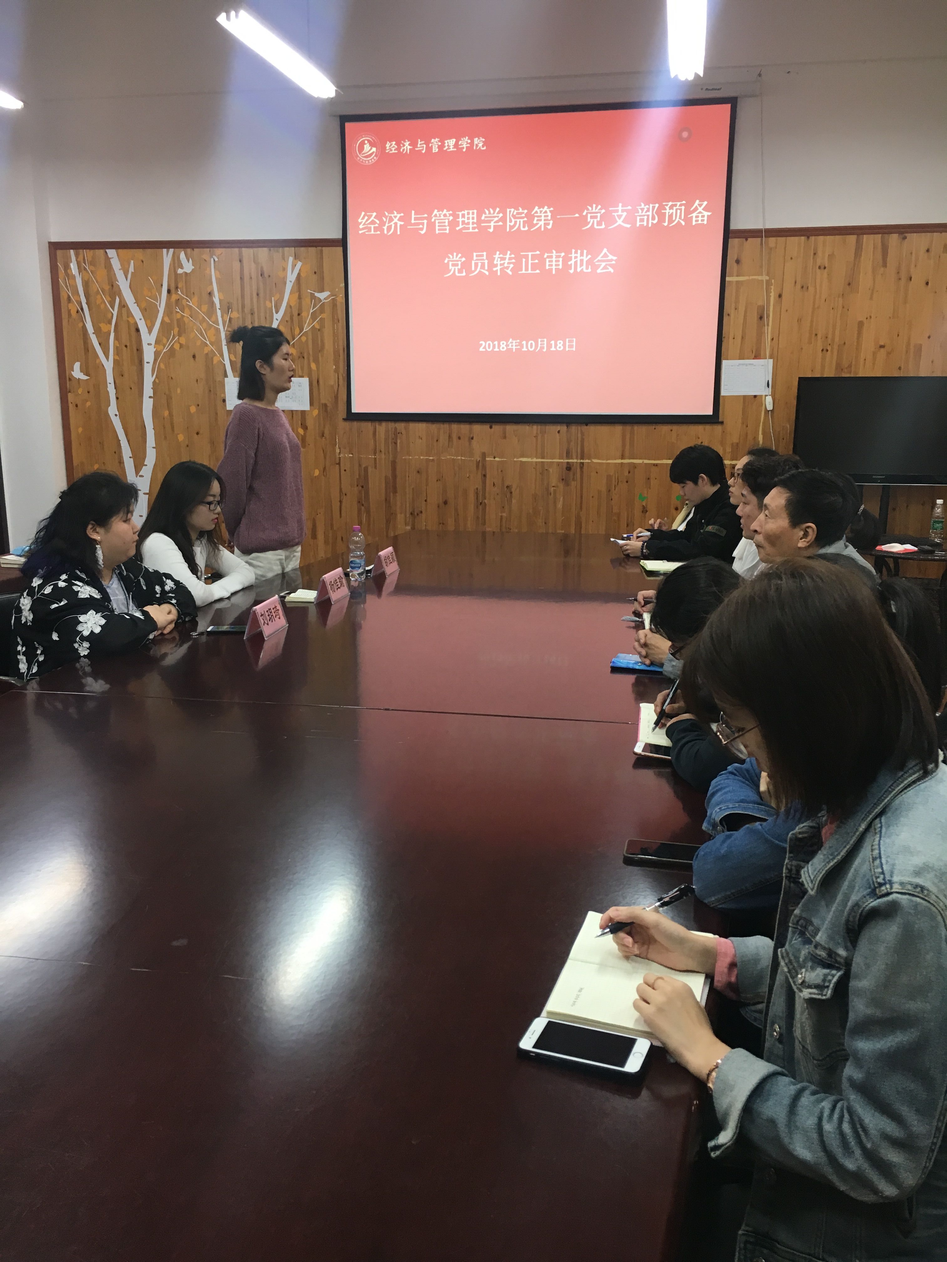 2018年10月18日15:45,经济与管理学院第一党支部于3号楼313召开刘玥琦、胡佳颖、杨佳瑜三名预备党员转正审批会。刘玥琦等3名同学于2017年9月19日经党支部大会讨论、票决,同意接收为预备党员,至今预备期已满。经党组织研究,决定召开党员大会,讨论这3名同志的转正问题。