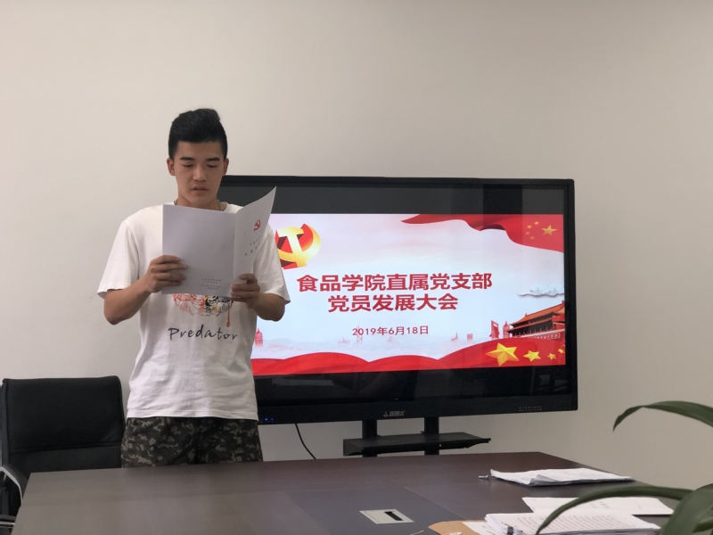 会议由党支部书记唐斌主持,宣读会议的主要内容以及会议流程。本次会议按照:发展对象本人宣读入党志愿书、培养联系人发表意见、报告发展对象政治审查情况等。
