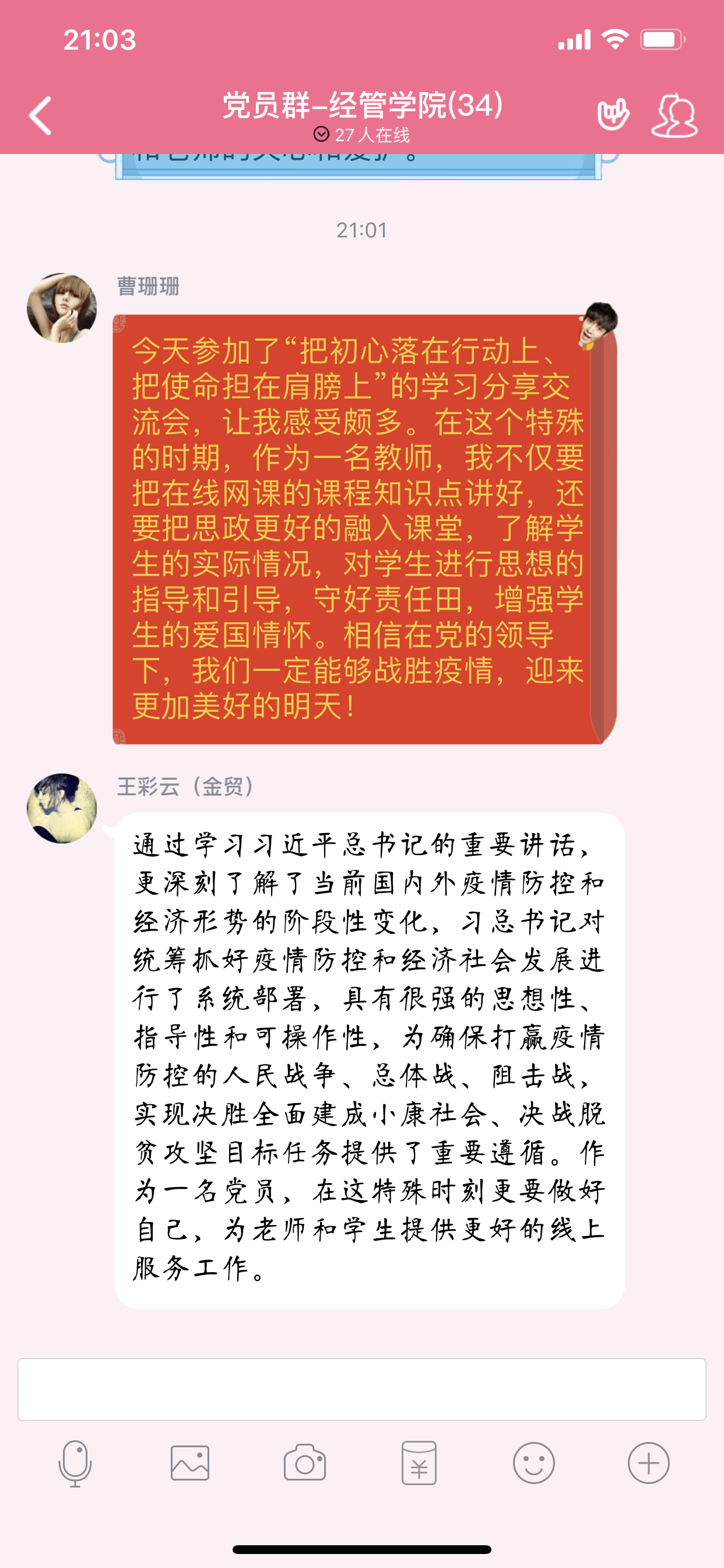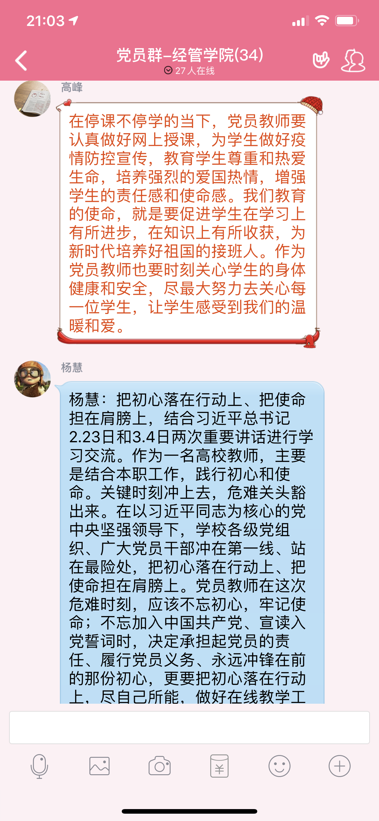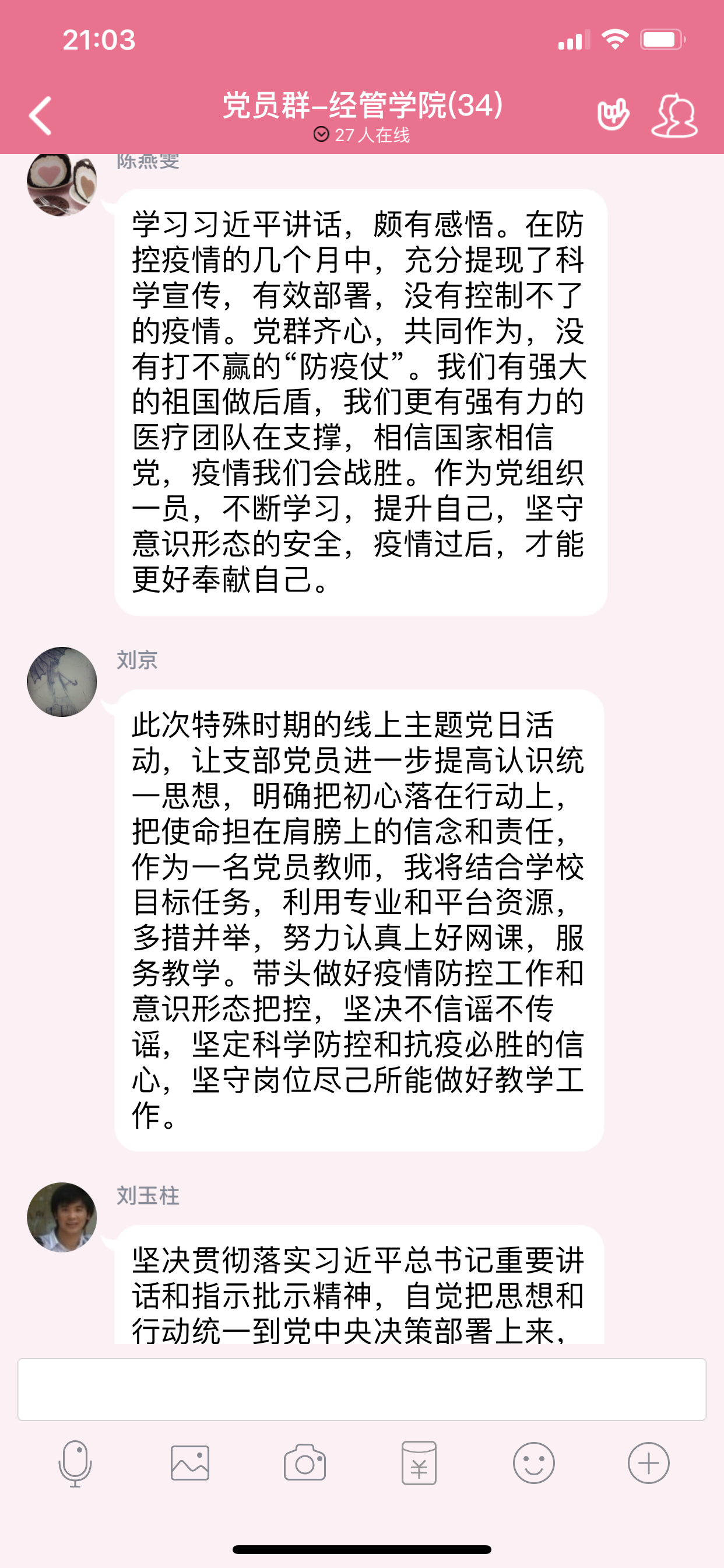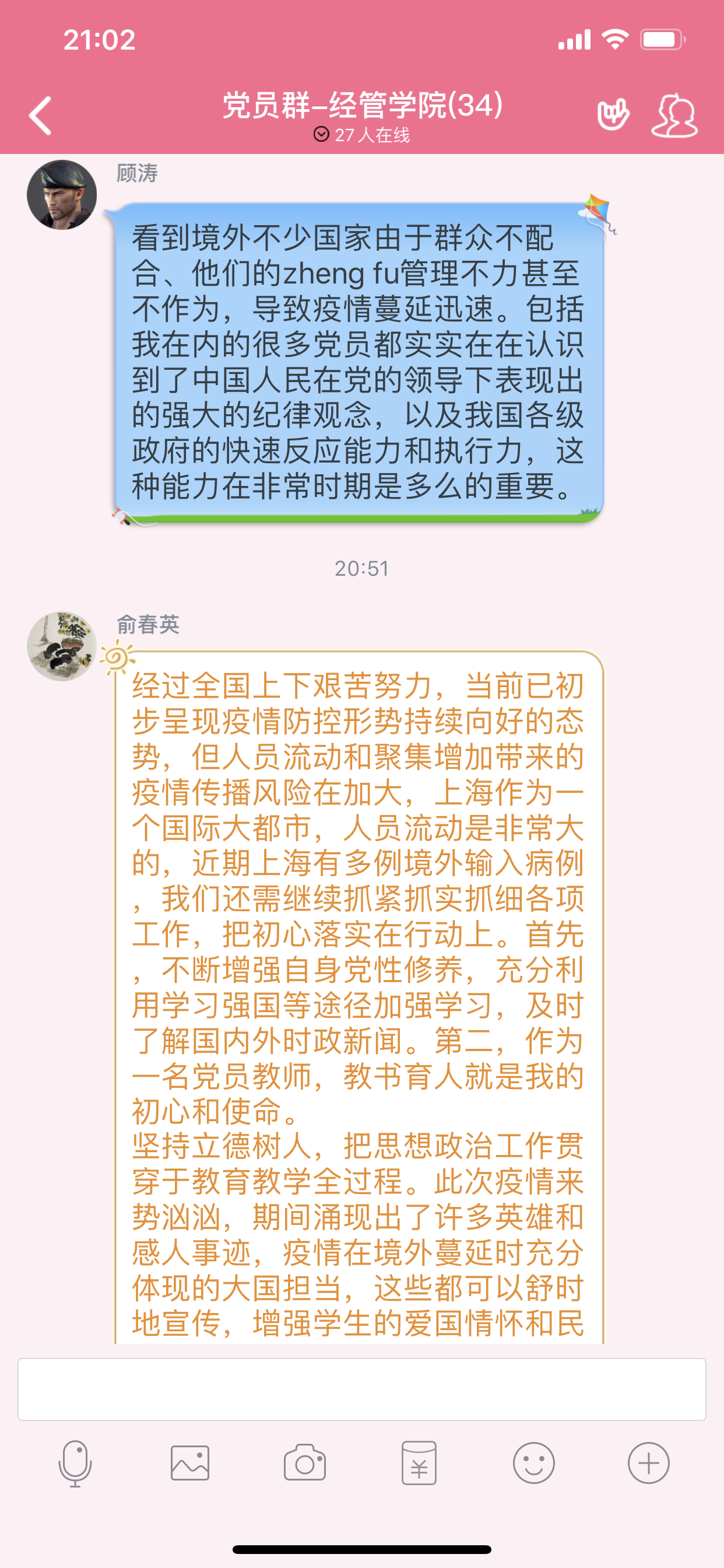 俞春英老师表示上海作为一个国际大都市,人员流动是非常大的,近期上海有多例境外输入病例,我们还需继续抓紧抓实抓细各项工作,把初心落实在行动上。首先,不断增强自身党性修养,充分利用学习强国等途径加强学习,及时了解国内外时政新闻。第二,作为一名党员教师,教书育人就是我的初心和使命。坚持立德树人,把思想政治工作贯穿于教育教学全过程。此次疫情来势汹汹,期间涌现出了许多英雄和感人事迹,疫情在境外蔓延时充分体现的大国担当,这些都可以舒时地宣传,增强学生的爱国情怀和民族自豪感,传播正能量,做好意识形态工作。第三,继续贯穿落实线上教学,增强必胜心、仁爱心、责任心、谨慎心,努力提升线上教育质量,及时了解学生的学习、生活和心理情况,给予正确的引导。