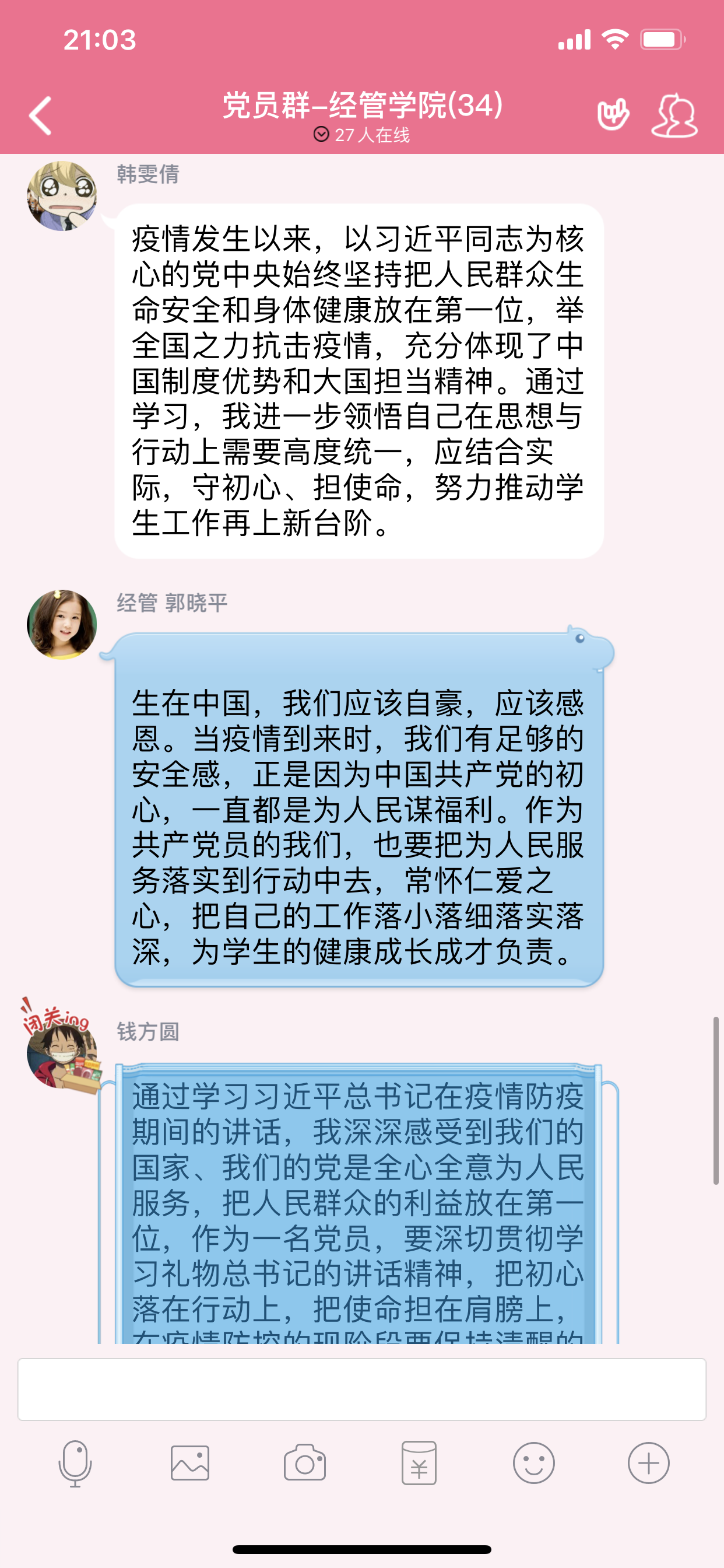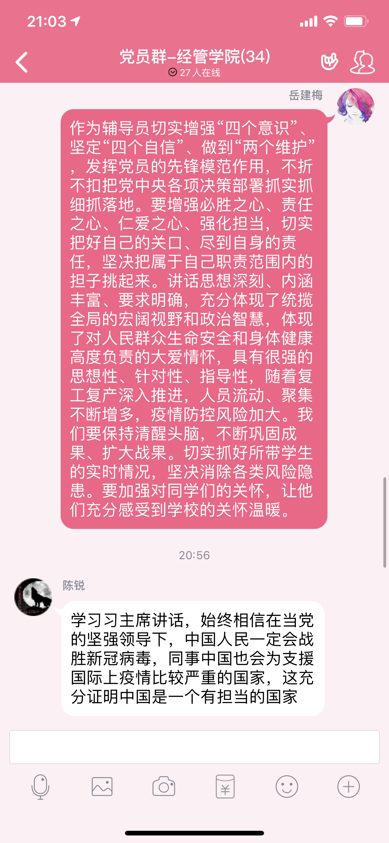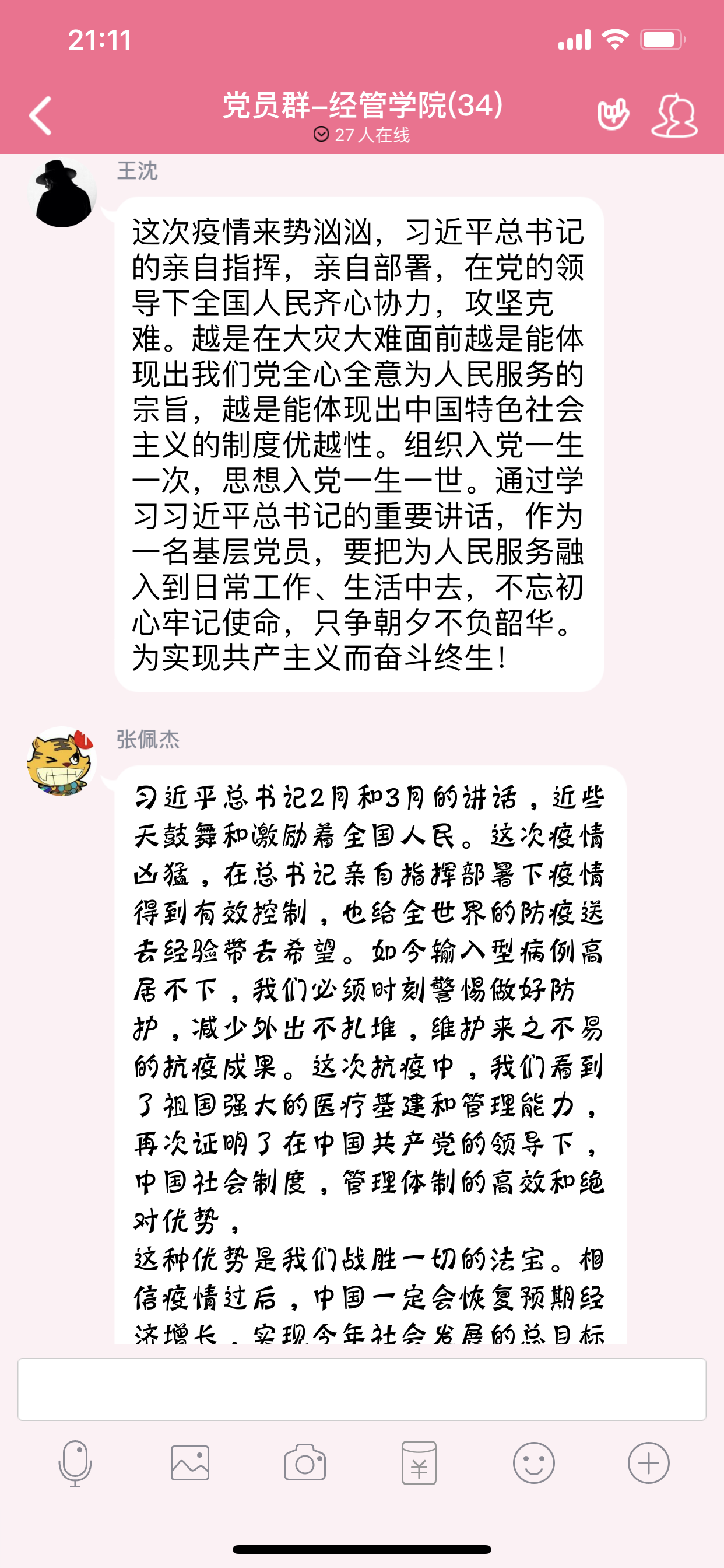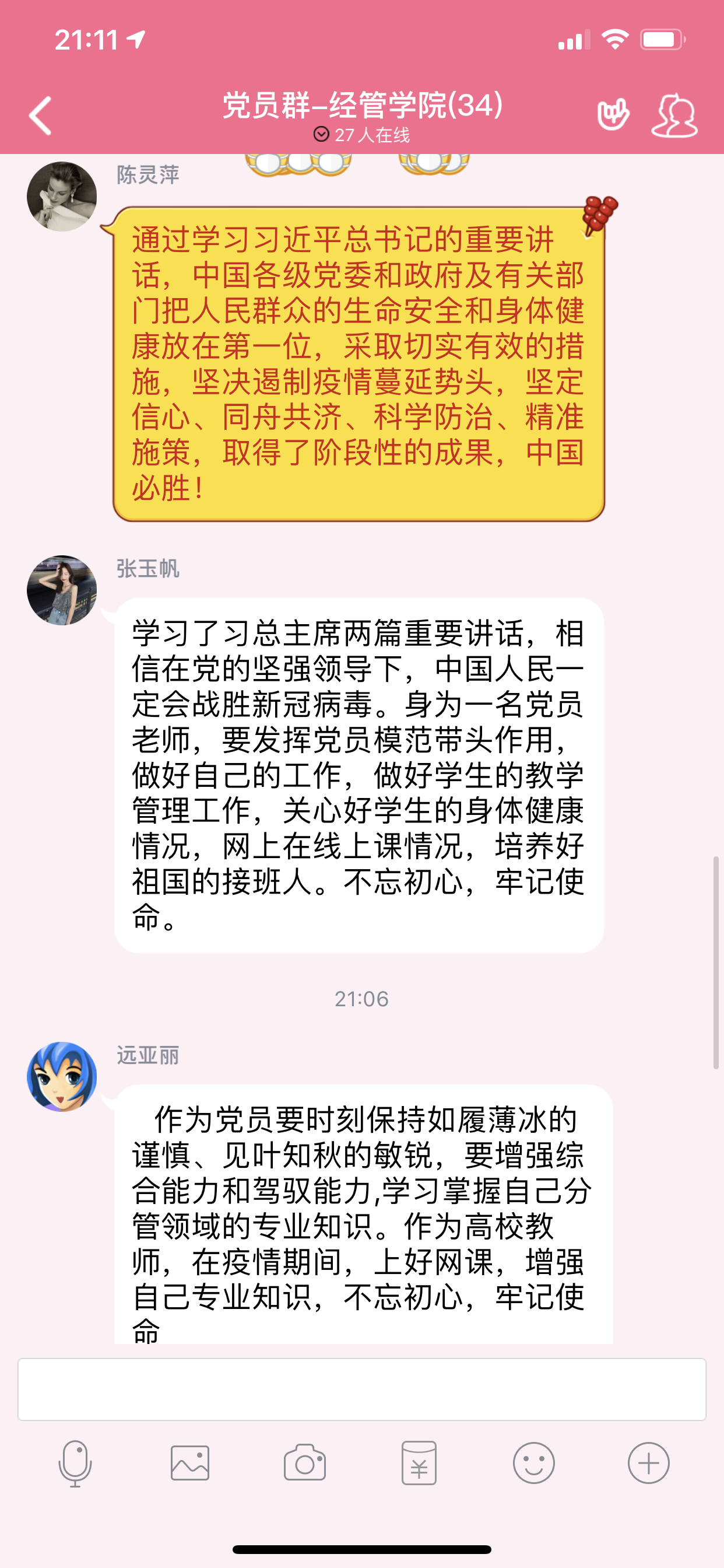 张佩杰老师表示习近平总书记2月和3月的讲话,近些天鼓舞和激励着全国人民。这次疫情凶猛,在总书记亲自指挥部署下疫情得到有效控制,也给全世界的防疫送去经验带去希望。如今输入型病例高居不下,我们必须时刻警惕做好防护,减少外出不扎堆,维护来之不易的抗疫成果。这次抗疫中,我们看到了祖国强大的医疗基建和管理能力,再次证明了在中国共产党的领导下,中国社会制度,管理体制的高效和绝对优势,这种优势是我们战胜一切的法宝。相信疫情过后,中国一定会恢复预期经济增长,实现今年社会发展的总目标和总任务。