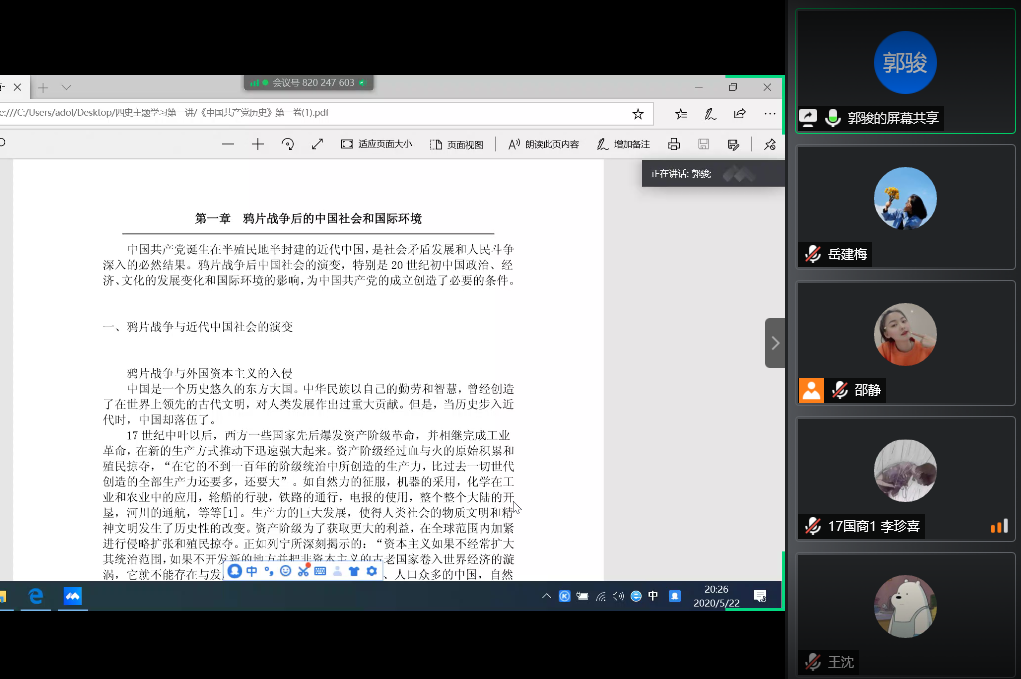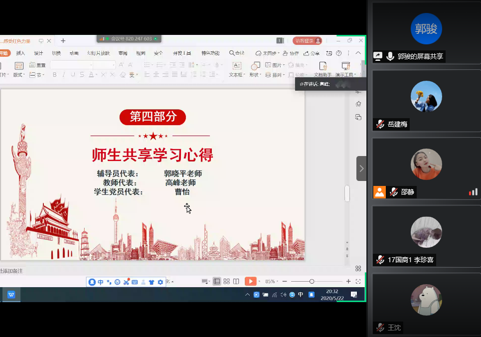 随后,教师和同学进行了学习心得交流。郭晓平老师从横向和纵向两方面为我们分享了学习四史的方法,一方面要将四史联系起来学习,从学习中理解它们之间在理论和实践上的逻辑关系;另一方面学习要循序渐进,从基础的历史认知到历史规律和教训,再到历史精神,最后尝试用历史方法解决现实问题。只有层次分明,把握重点,才能更深刻的看待历史,从而理解历史发展大势。高峰老师讲到党员干部要学习党史、新中国史、改革开放史、社会主义发展史,才能更好地增强“四个意识”、坚定“四个自信”,做到“两个维护”。历史教育在“立德树人”中具有不可替代的作用,作为高校教师,我们肩负着培养祖国接班人使命,要让大学生以史鉴今、坚定理想信念、牢记初心使命,汲取开拓前进的强大勇气和力量,奋力夺取疫情防控和经济社会发展双胜利。曹怡同学表示,作为一名预备党员,只有好好学习和了解“四史”,回顾我们的党、我们的新中国所走过的极不平凡而又光辉灿烂的征程,才能真切的从思想上、感情上和认知上,真正地体会和认同国家意识和家国情怀。