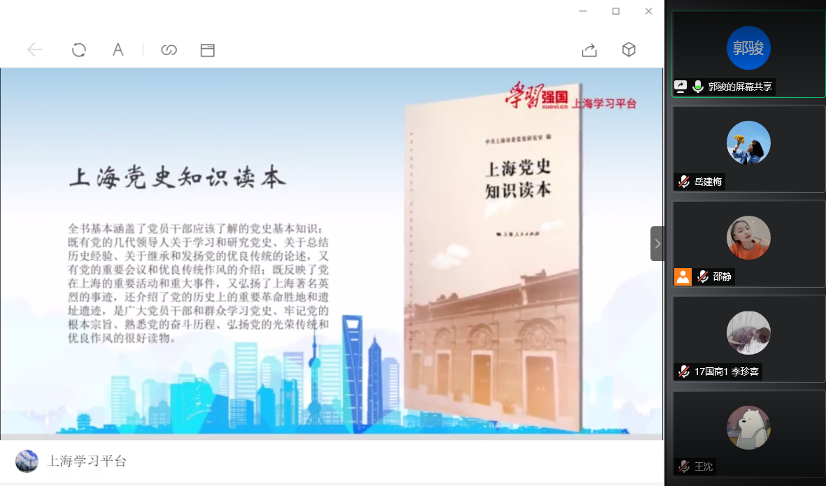 接着,郭骏老师带领全体党员共同观看了红色视频《长征路》。夹金山又名“大雪山”,这是红军二万五千里长征翻越的第一座大雪山,中央红军主力历时七天七夜,经历各种艰难险阻,全部翻过夹金山,与红四方面军胜利会师。通过观看视频,我们感受到“红军不怕远征难”的气魄,也被这种不怕牺牲的精神所鼓舞。观看视频后,在郭骏老师带领下,我们共同学习了由学习强国平台推出的上海红色文化材料以及共产党历史第一卷的内容。