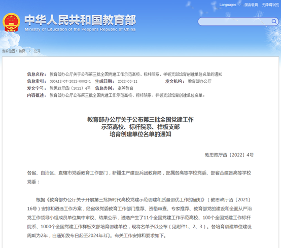 据悉,本次第三批新时代高校党建示范创建和质量创优工作是经党委教育工作部门推荐、资格审查、专家评审、教育部党的建设和全面从严治党工作领导小组成员单位集中审议,一共遴选产生了11个全国党建工作示范高校、100个全国党建工作标杆院系、1000个全国党建工作样板支部。