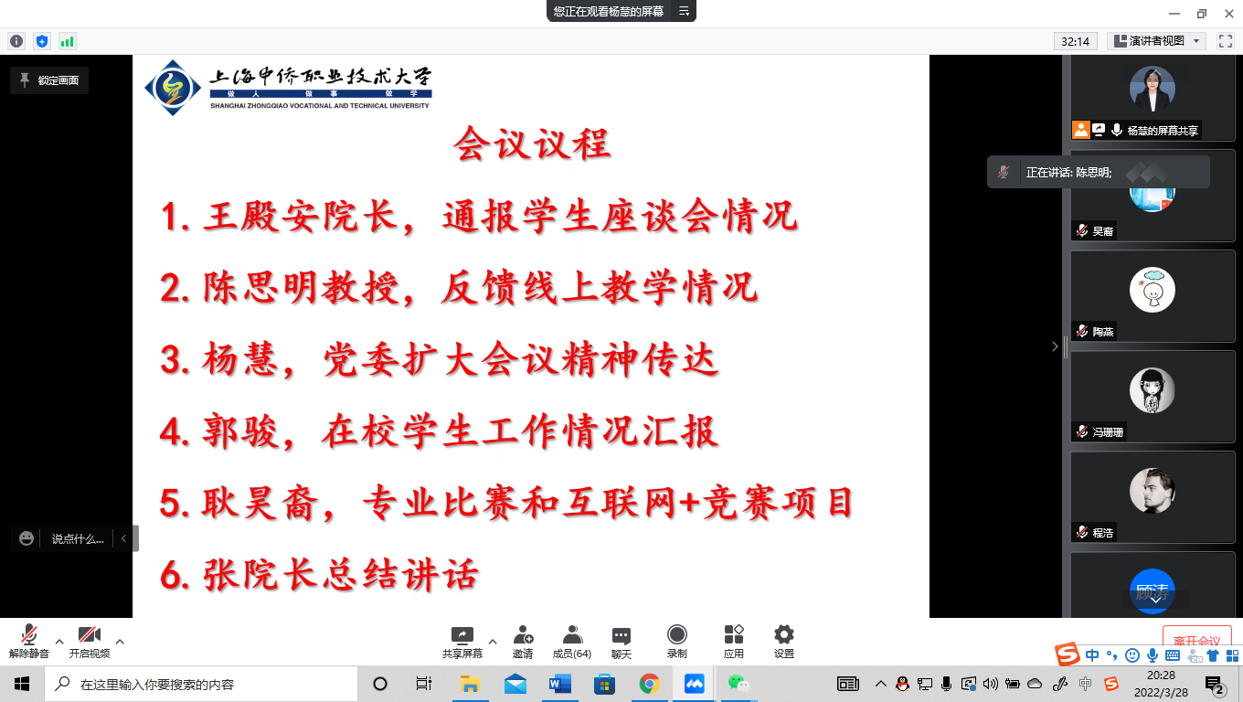 接着,学院督导陈思明教授总结反馈近期在线教学的情况。在上海抗疫的关键时期,各位老师在受到疫情直接影响的条件下,教师们克服困难,线上教学顺利开展。但是,也存在一些需要改进的地方:第一,录播课程看法比较大,希望不用或者少用录播形式,或在录播课程中选取部分视频插在课程中播放。希望教师与学生之间增强互动。王军老师打开视频头像,学生能看到老师,效果大不一样。第二,教学方法方面,存在部分老师网络操作技术不熟练,浪费不少授课时间,教学中的流畅性受到破坏;另外一个较大的问题是照本宣科的问题;在网课期间,克服网络技术的影响,合理安排教学时间;提高ppt的制作水平,比如李娟老师的ppt生动、形象,能吸引学生。第三,课堂上的互动问题。要提高教学质量,吸引学生是个关键的环节。俞春英老师、陈灵萍老师等互动环节都做的很好,值得各位老师借鉴和思考。第四,部分教师平铺直叙,没有突出重点。应该对重点、难度进行梳理,在教学设计中能够突出重点。第五,要重视课后作业的布置,可以通过微信群、qq群来了解学生的学习情况。
