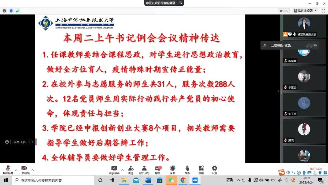 杨慧带领大家学习了3月以来学校党委下发的疫情防控工作指示。面对当前上海市疫情防控严峻复杂的形势,经管学院党总支快速响应学校党委和教务处号召,有序安排教职员工居家办公,确保所有党员到社区一线报到。经管学院在校外参与志愿服务的师生共31人,服务次数288人次。12名党员师生用实际行动践行共产党员的初心使命,体现责任与担当,同时也要做好自我防护。