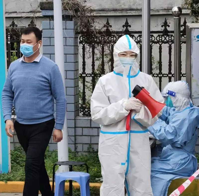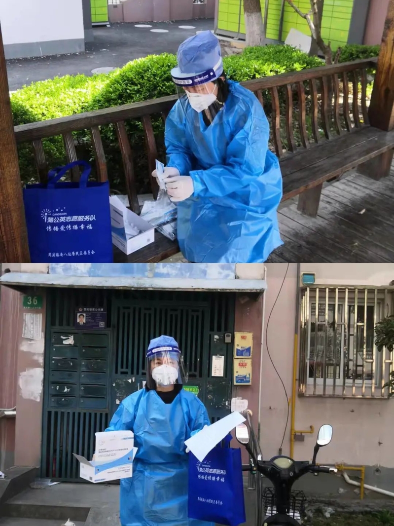 抗原试剂发放岗位上,一层一层地爬楼,一户一户地敲门,不厌其烦地一遍又一遍讲解使用方法和指导居民使用试剂,并一起帮助一些不会操作的居民完成了测试。
