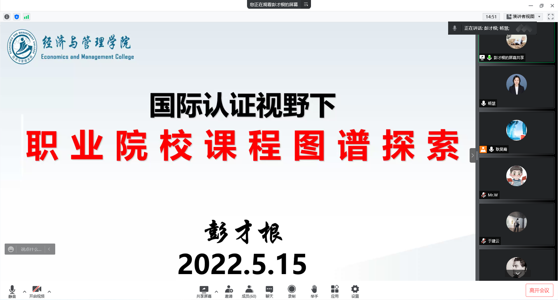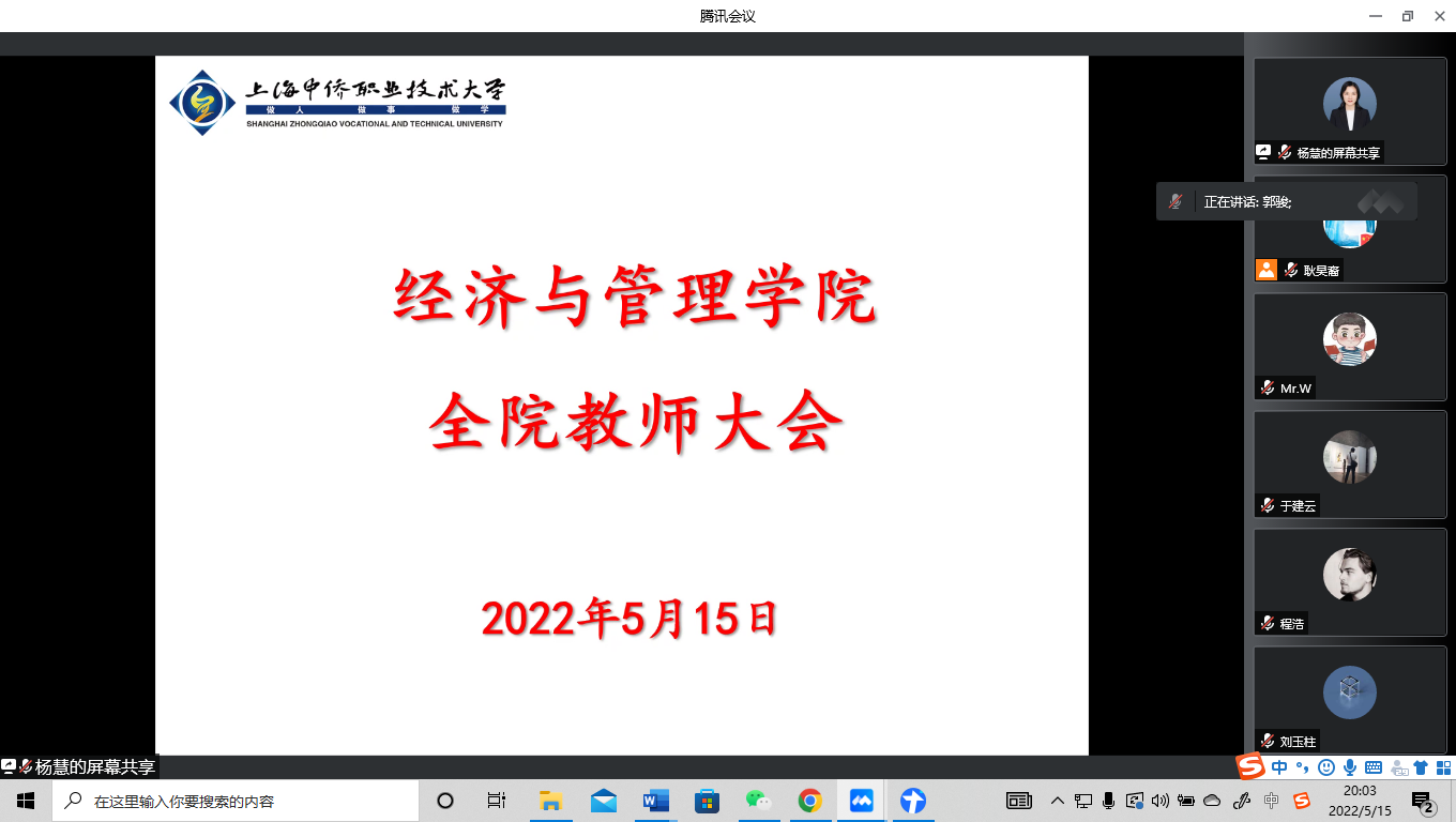 为推进国际认证、毕业生就业等各项工作,2022年5月15日,经管学院通过腾讯会议召开全院大会。张炳达院长、杨慧书记、王殿安和范海燕副院长、郭骏副书记,以及全院教师、辅导员和行政人员参加大会。会议由杨慧书记主持。