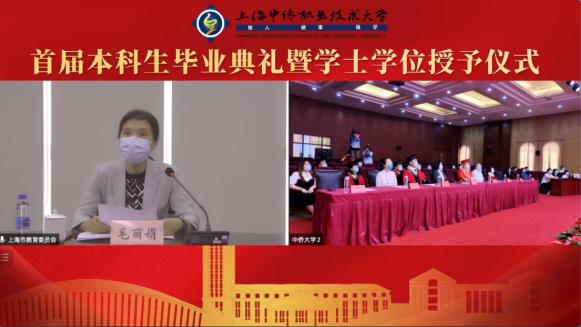 副校长周晓芳宣读表彰《上海市优秀毕业生和上海中侨职业技术大学优秀毕业生的决定》,党委书记平杰宣读授予《学士学位名单》,校长霍佳震教授为获得学士学位的毕业生代表颁发学位证书、拨正帽穗、合影留念。