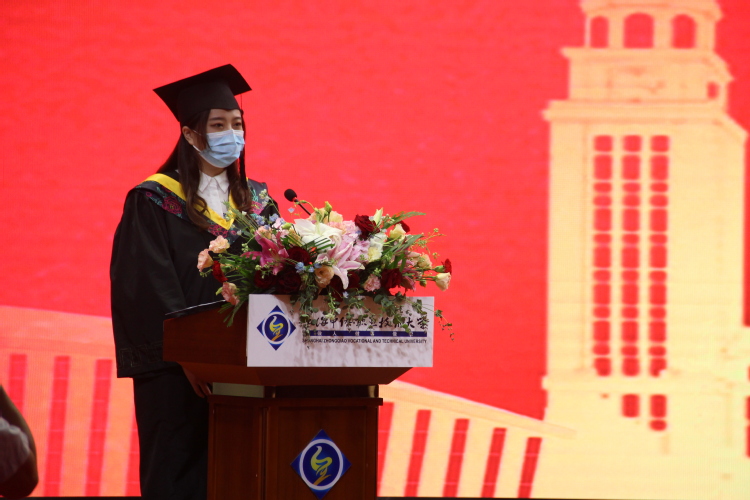 2022届优秀本科毕业生代表,上海市奖学金、上海市优秀毕业生,信息工程学院2020级数字媒体技术专业毕业生吴玮琪发言:我们就像是一颗树苗,扎根在中侨的沃土,汲取着做人、做事、做学的养分,一同学习、一同生活、一同成长,感谢母校的教育与培养,我们将永怀励志之情做不懈的奋斗者,我们将永存求真之心,做终生的学习者,我们将永远铭记做人、做事、做学的孝心,在青春的赛道上奋力奔跑。