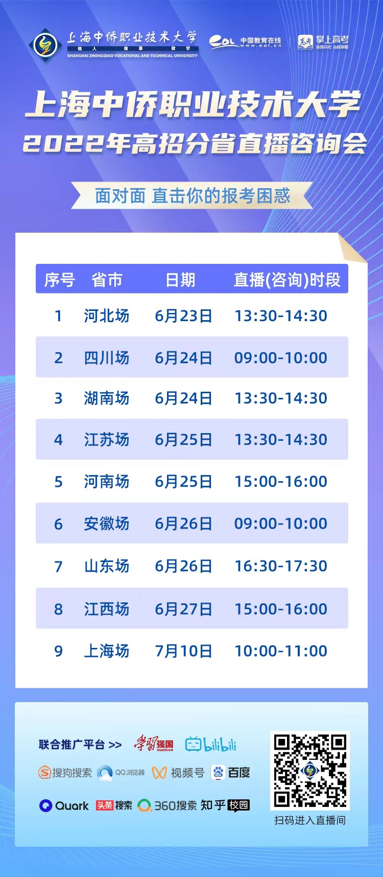 上海中侨职业技术大学2022年高考招生全国分省市直播咨询会,马上开始!!