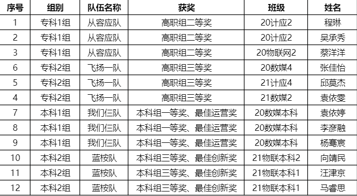 经过激烈角逐,信息工程学院由杨玲、刘群、唐斌、张玉老师带队组建4支队伍参赛,荣获本科组一等奖,三等奖;专科组二等奖、三等奖,其中两个团队分别荣获最佳运营奖和最佳创新奖的荣誉,其中“我们仨”队晋级国赛。