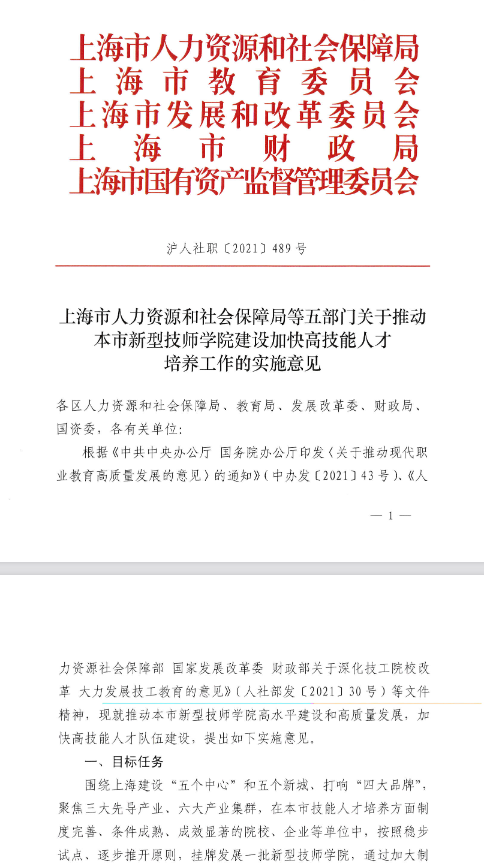 根据上海市人力资源和社会保障局等五部门印发的沪人社职〔2021〕489 号文,大力推动新型技师学院建设,加快高技能人才培养,有利于促进及提高上海职业教育与技能培训水平,为培养大批高素质技术技能人才提供强有力支撑;有利于大力弘扬精益求精的工匠精神,营造尊重劳动、崇尚技能的社会氛围;有利于更好地服务上海三大先导产业、六大产业集群,推进经济社会可持续发展;有利于对接世界技术标准和技能要求,促进与世界先进水平接轨。
