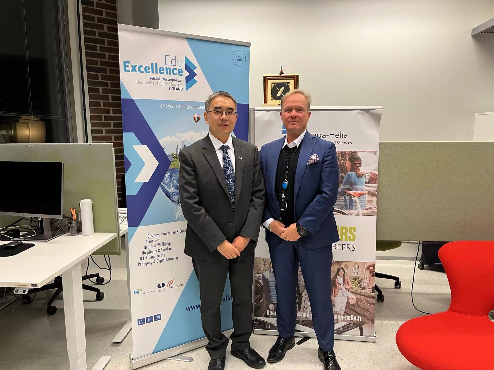 我校刘淑芸副校长于5月5日回访了芬兰国立应用科技大学联盟中国代表处,并就加快推进我校与芬方院校合作事宜同代表处赵刚主任进行了深入的交流。刘校长和赵主任围绕合作专业领域、合作模式等问题交换了意见。双方一致认为应争取尽快启动中芬国际办学项目合作,同时抓实短期学生交流工作,以实实在在的早期收获促进双方合作的长远发展。