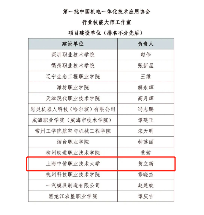 近日,第十三届中国国际机器人高峰论坛暨第九届恰佩克奖颁奖大会成功召开,中国机电一体化应用技术协会公布了第一批中国机电一体化行业技能大师工作室建设名单并举办了授牌仪式。上海中侨职业技术大学成为首批建设单位。