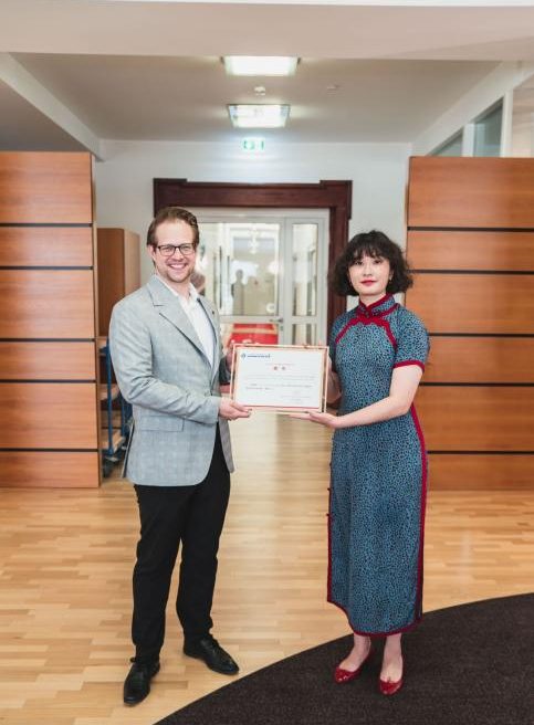颁发仪式后,严蕙院长受邀参加了DHBW国际商务大三学生的课题报告会,该报告主要围绕学生对政府回收中心的改良方案展开。严蕙院长对学生的报告内容表示了极大肯定,并诚挚邀请DHBW师生到中侨大学参观交流。双方就未来两校间的进一步合作交流展开了友好的讨论。