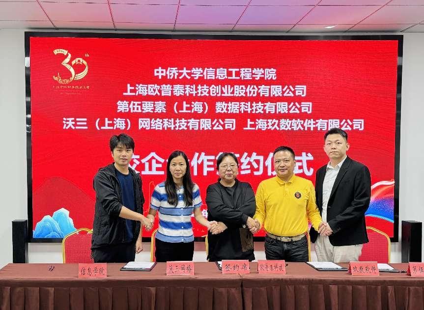沃三(上海)网络科技有限公司 、第伍要素(上海)数据科技有限公司、上海玖数软件有限公司、上海欧普泰科技创业股份有限公司、上海亿燃文化科技有限公司、上海浮玉影业有限公司、上海匠美文化科技有限公司出席签约仪式。