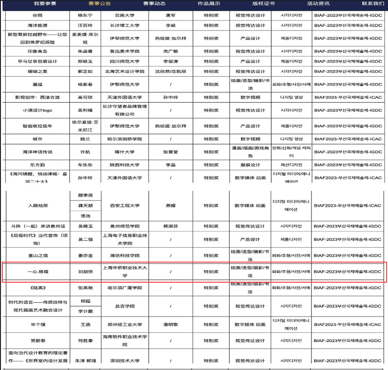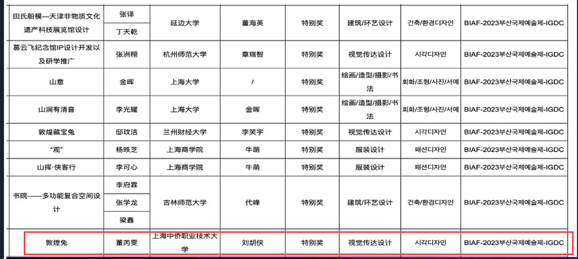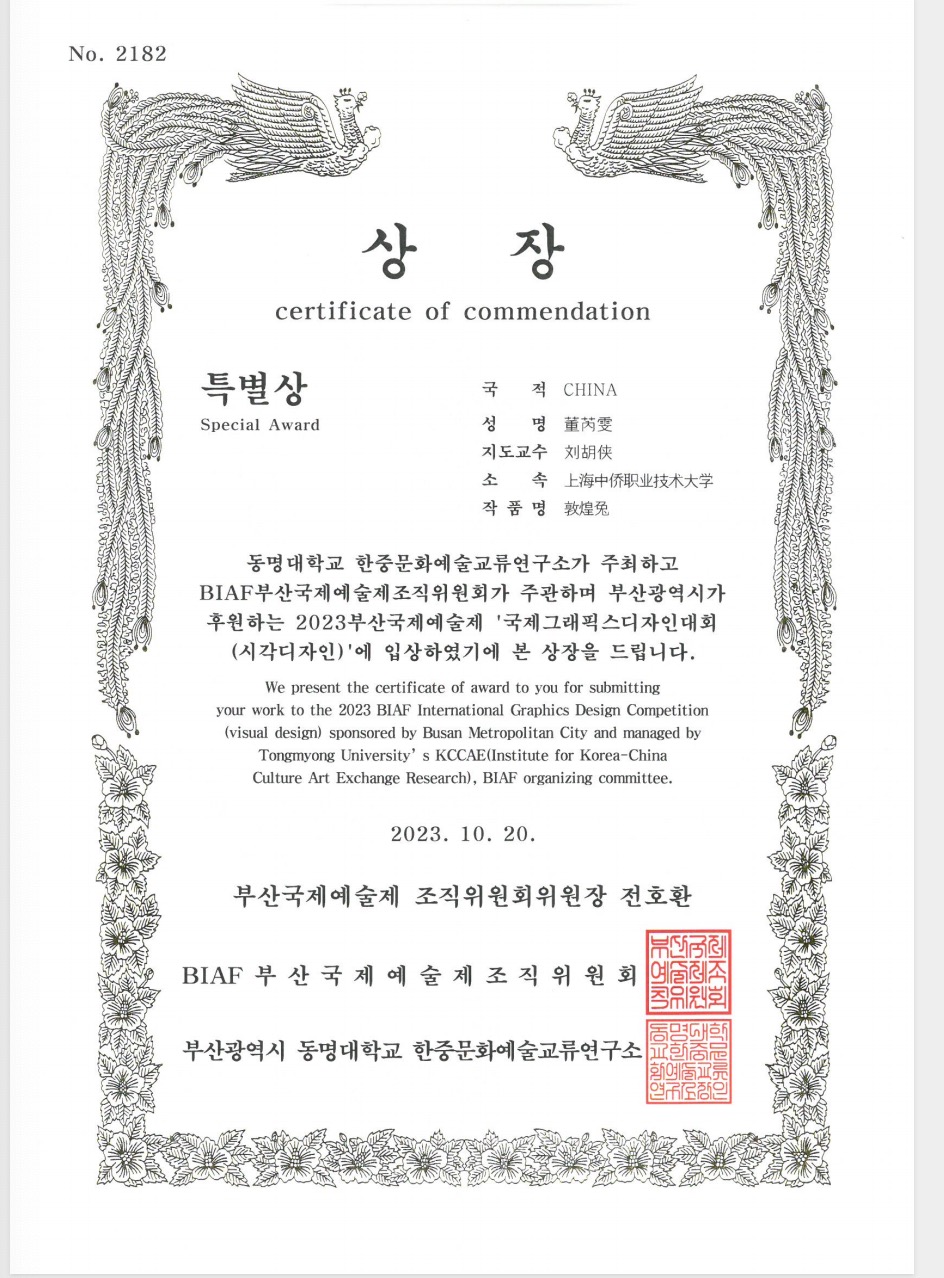 2023年10月3-10日,BIAF2023总决赛评审会在韩国釜山举办。来自全球74个国家或地区推送的作品近10000件作品进入BIAF2023总决赛,依照既定评审流程,最终评出获奖作品1171件,其中,中国区获奖作品188件。其中信息工程学院刘胡侠老师的《一心.移疫》作品和董芮雯同学的《敦煌兔》作品分别获得全球总决赛特别奖。此次获奖展示了信息学院院教师专业设计能力的深度及国际视野拓展的宽度,更是学院人才培养国际化成果的呈现。