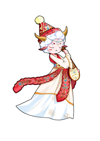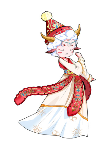 通过将那拉提的自然美景、文化和特色元素融合在一起,创造出了“古丽咩”这个动漫形象IP和衍生品。古丽咩形象源于新疆的特色动物羊然后再将其拟人化。根据羊的基本形象,优雅的羊少女穿着新疆特色的维吾尔族服饰,头顶带有那拉提特色纹样的帽子。配色采取了通红的颜色,与其穿着的米色裙子形成衬托,同时结合了新疆非遗琴弹拨尔,显得灵动又可爱。通过这个动漫形象IP衍生出了具有特色的帆布袋钥匙扣等产品。