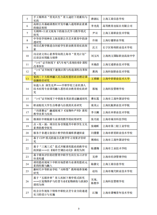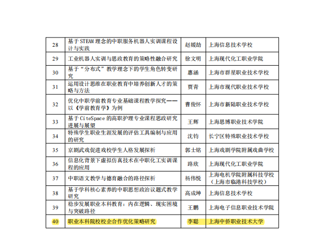 我校积极响应,鼓励教师参与申报。在科研处的组织带领下,经专家评审有5位老师获奖。其中艺术学院胡冰寒老师的论文《基于“双链”影响下的职业本科教育课程体系改革策略研究》和智能制造学院丰玉强老师的论文《高职院校国际化发展策略研究-以上海中侨职业技术大学为例》分别获二等奖;马克思主义学院王雅娜老师的论文《党的二十大精神融入民办高校思想政治理论课创新路径研究》和艺术学院李聪老师的论文《职业本科院校校企合作优化策略研究》分别获三等奖;经济与管理学院杨维老师的论文《职业本科会计专业内涵建设的探索与实践——以上海中侨职业技术大学大数据与会计专业为例》获得提名奖。