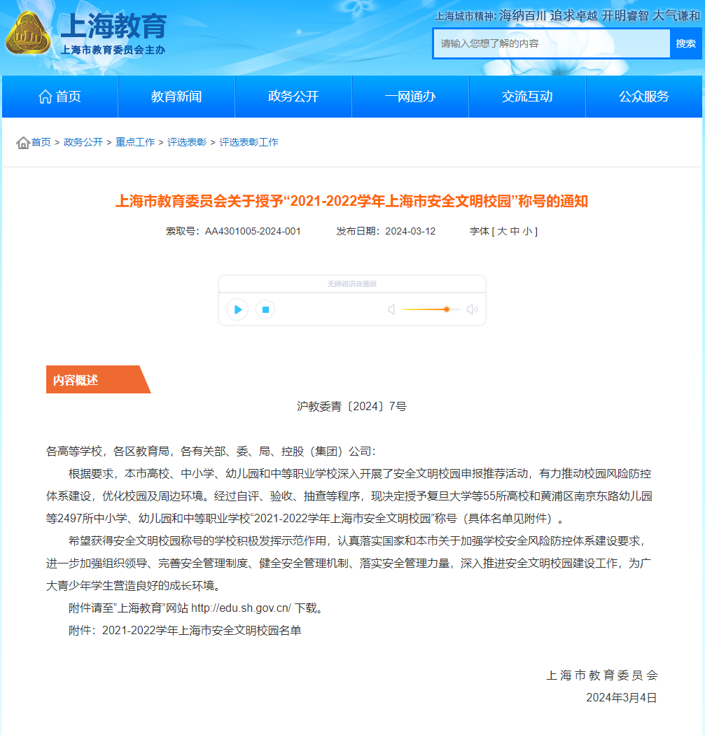 “2021-2022学年上海市安全文明校园”评选活动落下帷幕,我校踊跃报名,认真准备,经过学校自查、汇总申报、区级审核、市级审核等层层选拔评比,最终获得了“2021-2022学年上海市安全文明校园”称号!