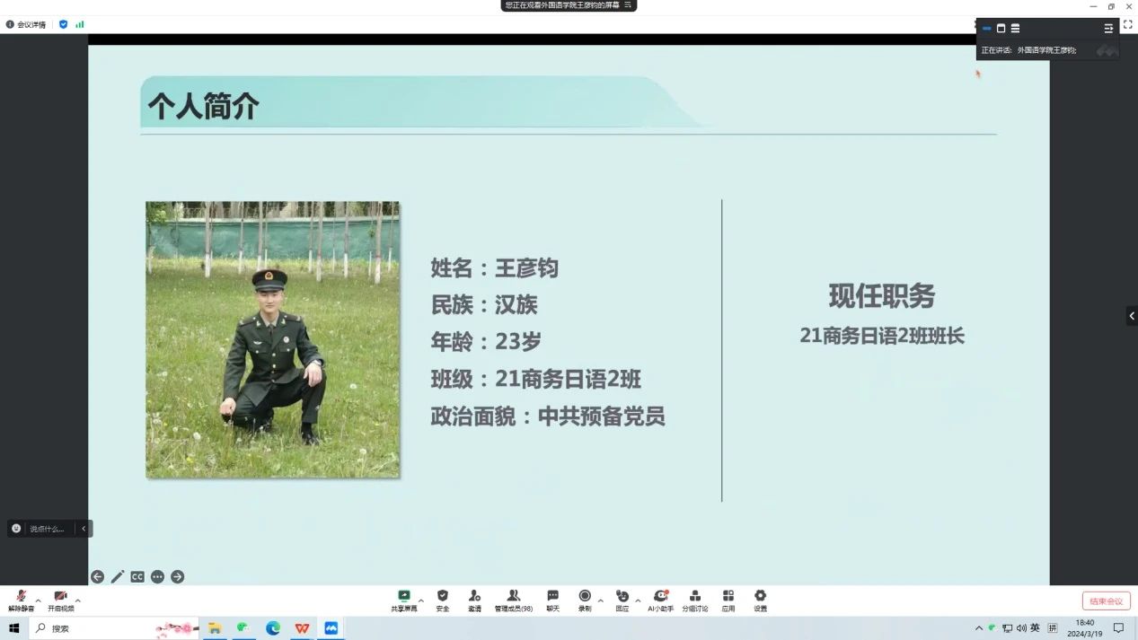 为解答同学们的学习困惑,帮助同学们提高学习效率,外国语学院团委、学生会组织了优秀毕业生学习经验分享会系列讲座。本次学习分享会我们请到了21商务日语2班的王彦钧同学,王彦钧同学曾任外国语学院学生会主席团成员,21商日2班班长,荣获国家奖学金、校一等奖学金等各种奖项。