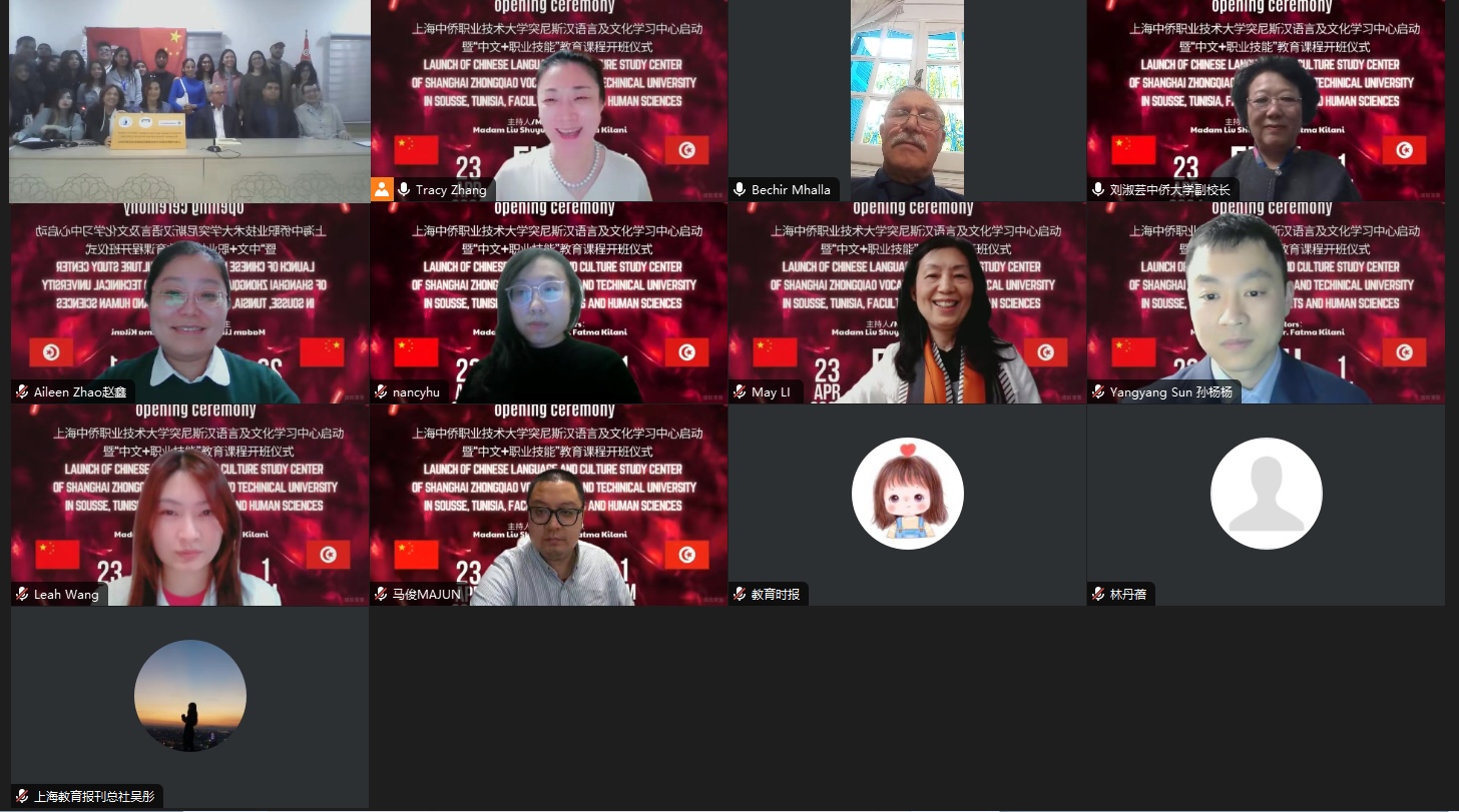 4月23日,上海中侨职业技术大学隆重举行了突尼斯汉语言及文化学习中心的启动暨“中文+职业技能”教育课程开班仪式。亚非国际发展联盟亚太区主席Tracy Zhang女士、亚非国际发展联盟秘书长Bechir Mhalla先生、突尼斯苏塞大学(University of Sousse)副校长Moez Khenissi教授、艺术与人文科学学院副院长 Monia Chouari教授、上海中侨职业技术大学副校长刘淑芸、外国语学院院长李梅出席启动仪式并致辞,我校国际交流处、宣传部参加会议。启动仪式由亚非国际发展联盟亚太区主席Tracy Zhang和艺术与人文科学学院Fatma Kilani博士共同主持。