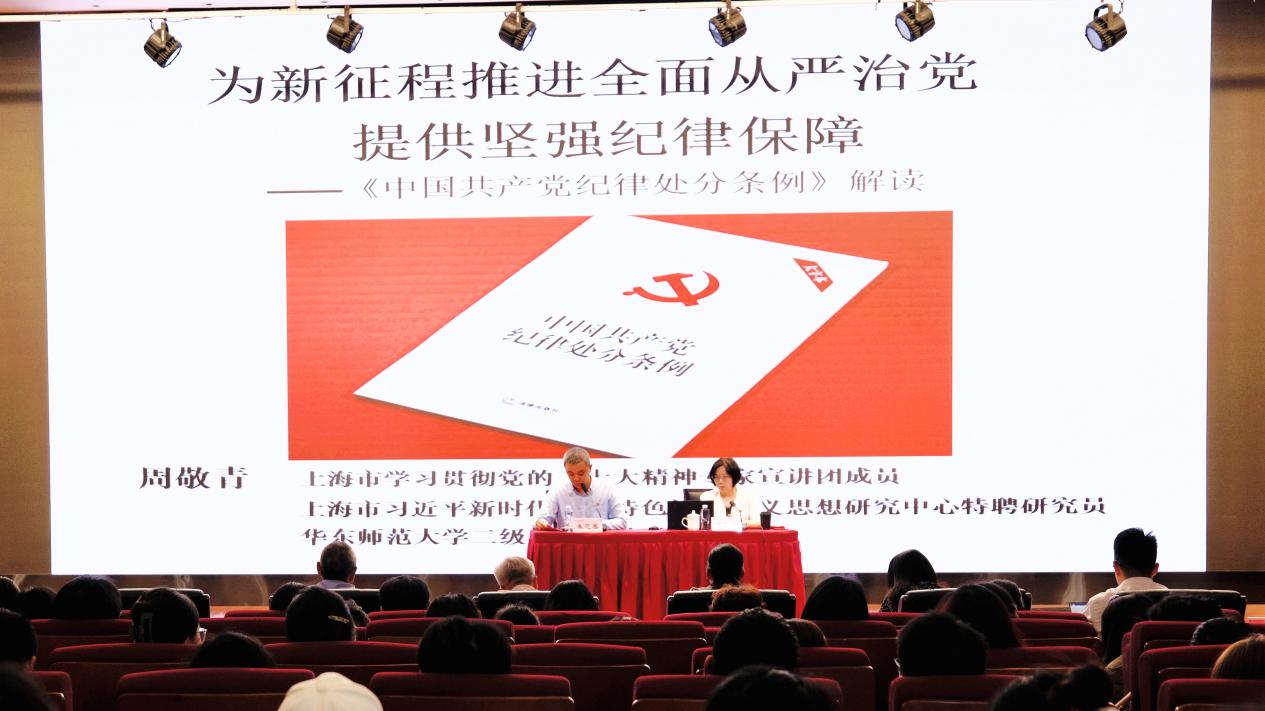 为深入学习贯彻习近平总书记关于加强党的纪律建设的重要论述,准确把握新修订的《中国共产党纪律处分条例》(以下简称《条例》)的内涵要义和实践要求,扎实推进党纪学习教育走深走实,5月24日下午,上海中侨职业技术大学党委组织开展党纪学习教育专题培训,校党委副书记、纪委书记朱范鑫作开班动员,并邀请华东师范大学特聘教授、上海市学习贯彻党的二十大精神专家宣讲团成员、上海市马克思主义研究会副会长周敬青作开班第一讲专题辅导报告。张堰镇党委委员(党委委员王成、党委委员、副镇长李文、罗志成、鞠东斌、夏伟君、蒋根木)、学校党委委员、纪委委员、党总支、支部书记、中层干部以及学生党员在图文楼二楼报告厅参加专题培训班学习。