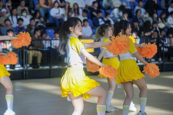 在紧张刺激的篮球总决赛中场休息时刻,校园健美操队为在场的观众带来了一场精彩绝伦的啦啦操表演。队员们身着鲜艳的服装,手持彩球,以充满活力的舞步和精准的同步动作,展现了青春的活力与激情。