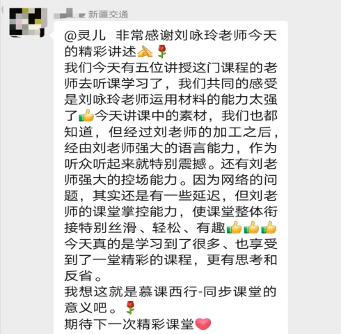 课后,新疆交通职业技术学院的师生表示,郜教授深入浅出的精彩演讲让学生们享受了一场“高质量的文化盛宴”,刘咏玲老师的语言魅力和灵活运用教学案例的能力不仅活跃了课堂氛围,同时也激发了大家的学习兴趣。这种独特的跨地域学习体验实现了两校学生在云端共同创新、优质课程共学共享的美好愿景,希望两校能够以此为契机,搭建多元化的交流合作平台,在学科建设、人才培养以及课程建设等方面开展更密切的合作,携手打造东西部职业院校同步课堂合作交流的典范。