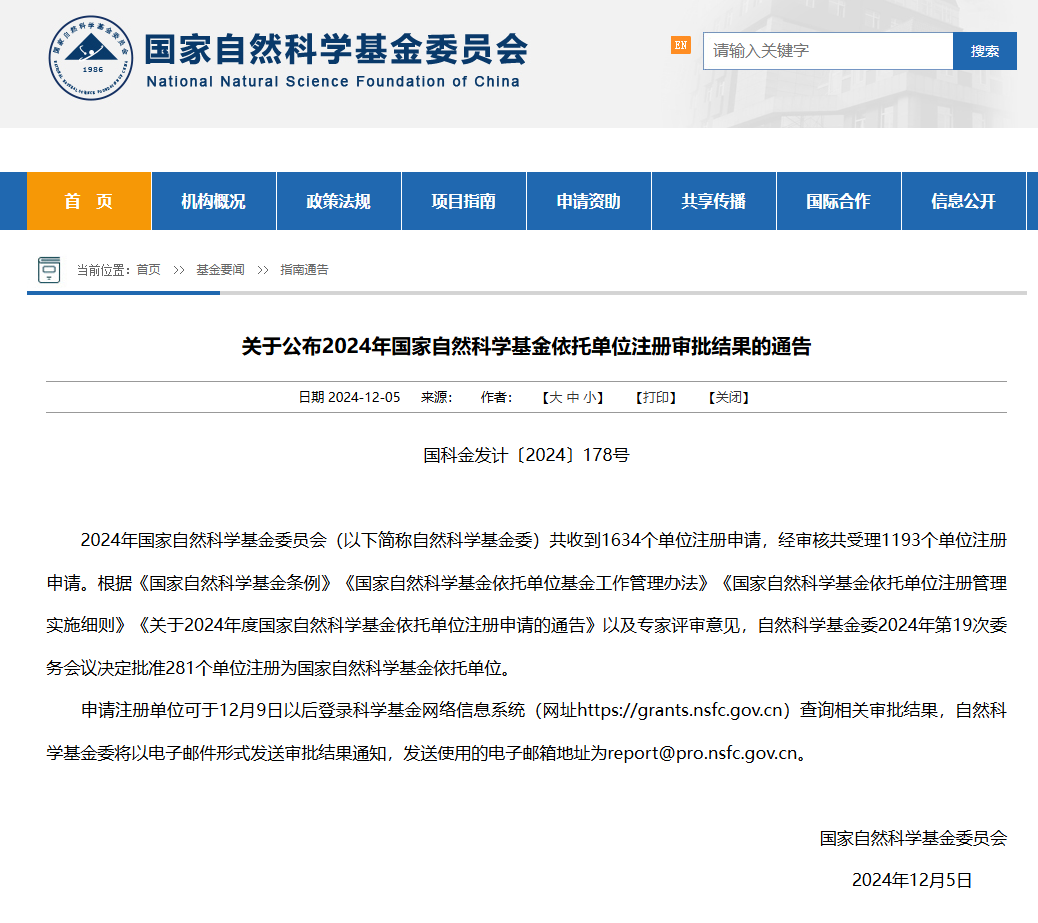 根据《国家自然科学基金依托单位基金工作管理办法》、《国家自然科学基金依托单位注册管理实施细则》和《关于2024年度国家自然科学基金依托单位注册申请的通告》等相关规定,经国家自然科学基金委员会委务会议审议,上海中侨职业技术大学被批准为国家自然科学基金依托单位,单位注册代码为:20151424A0123。