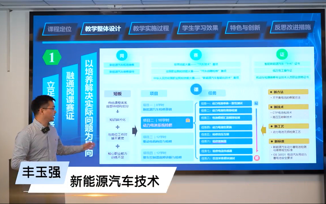 《新能源汽车技术》课程作为汽车服务工程技术专业的一门专业核心课程,对学生学习后续专业课程具有重要支撑作用,在汽车相关的专业人才培养中占有重要的地位。课程设计围绕“汽车强国,有你有我;匠心筑梦,技能成才”的课程思政育人主线展开。基于“岗课赛证”融通理念,课程聚焦新能源汽车机电维修等岗位,根据新能源汽车检测、故障诊断及维修等典型工作任务,对标“1+X”证书制度,瞄准“动力电池检测维修证书”,对接“世界-国家-市”三级职业技能大赛“汽车故障检修”和“汽车营销”赛项,融入新方法、新技术、新工艺和新标准,制定专业人才培养方案和课程标准,创设难度递进的12个任务和7个训练性项目。在授课过程中综合运用DeepSeek大语言模型、VR 虚拟现实等数字技术,深度挖掘产学资源,创建任务驱动型“理虚实”一体化教学体系;精心设计“资讯-计划-决策-实施-检查-评价”六个教学环节,实现“懂技术、会管理、强创新”三维任务目标;以就业为导向,推进学生岗位胜任能力与职业发展潜力融合。