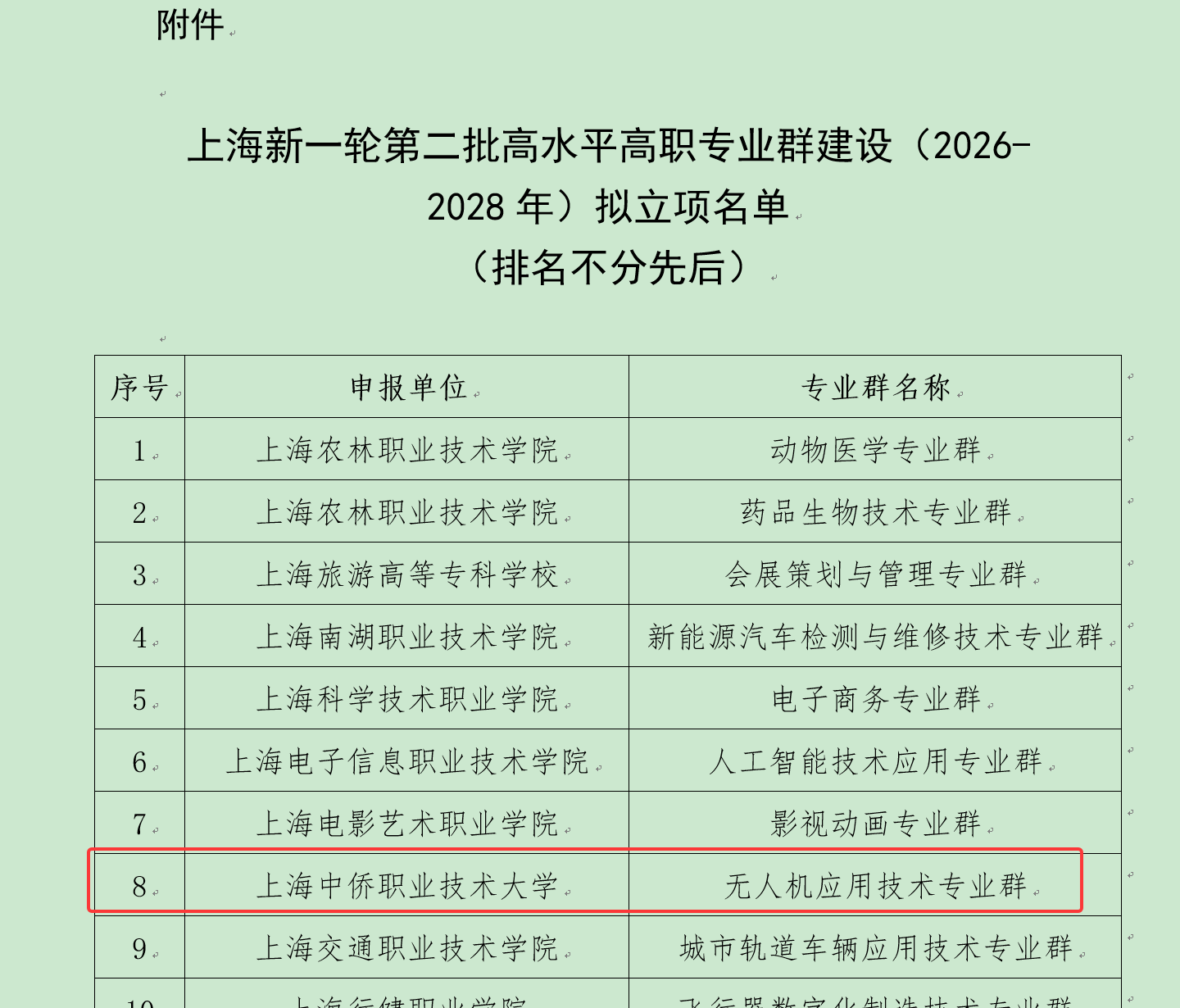 近日,上海市教育委员会职业教育处公示新一轮第二批高水平高职专业群建设(2026-2028年)拟立项名单,上海中侨职业技术大学“无人机应用技术专业群”成功入选,标志着我校在低空经济领域人才培养再获官方认可。