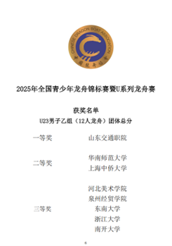 近日,2025年全国青少年龙舟锦标赛暨U系列龙舟赛在海宁鹃湖公园圆满收官。作为全国青少年龙舟领域的顶级赛事,本次盛会吸引了全国20个省市的63支队伍、1000余名运动员齐聚赛场。中侨大学龙舟队作为上海市唯一代表队,出战U23男子乙组赛场,与浙江大学、南开大学、武汉大学、中国科技大学等国内知名高校同台竞技,经过激烈比拼,中侨大学龙舟队总积分排名并列第二名,斩获总成绩二等奖,充分展现了中侨青年的热血与力量;另外,我校龙舟队的团队节目《上海滩》在龙舟文化才艺展示评分中斩获二等奖,也展现了中侨学子的青春风采。