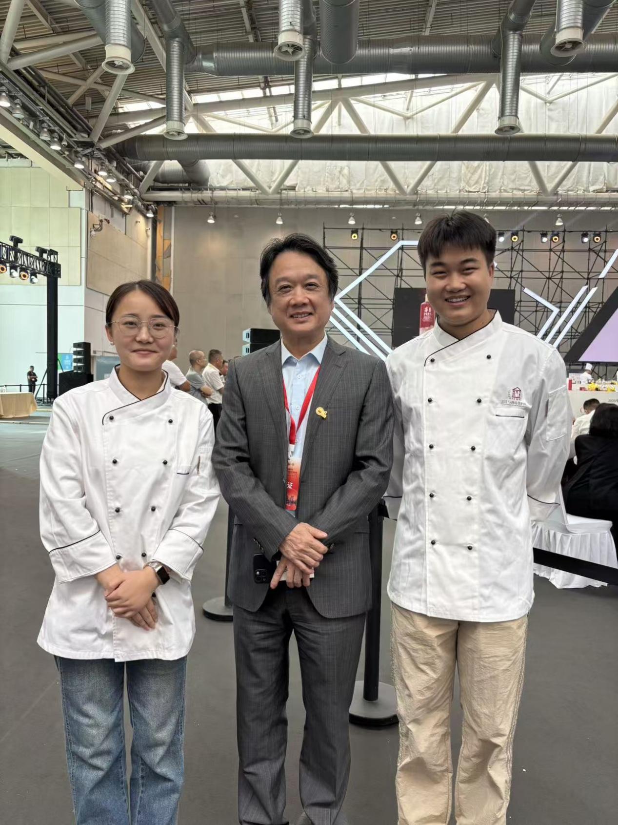 赛事期间,享有国务院特殊津贴专家、淮扬菜非遗传承人、中国烹饪协会副会长周晓燕先生作为嘉宾亲临。我校王博涵、王楚红两位教师专程向周大师请教并合影。周晓燕先生亲切询问了我校教师的备赛情况,结合赛场表现给予专业指导,并勉励他们“坚守匠心、勇于突破,充分展现学院风采”。这一交流场景生动体现了我校“大师引领、以赛促教”的育人理念与传承精神。