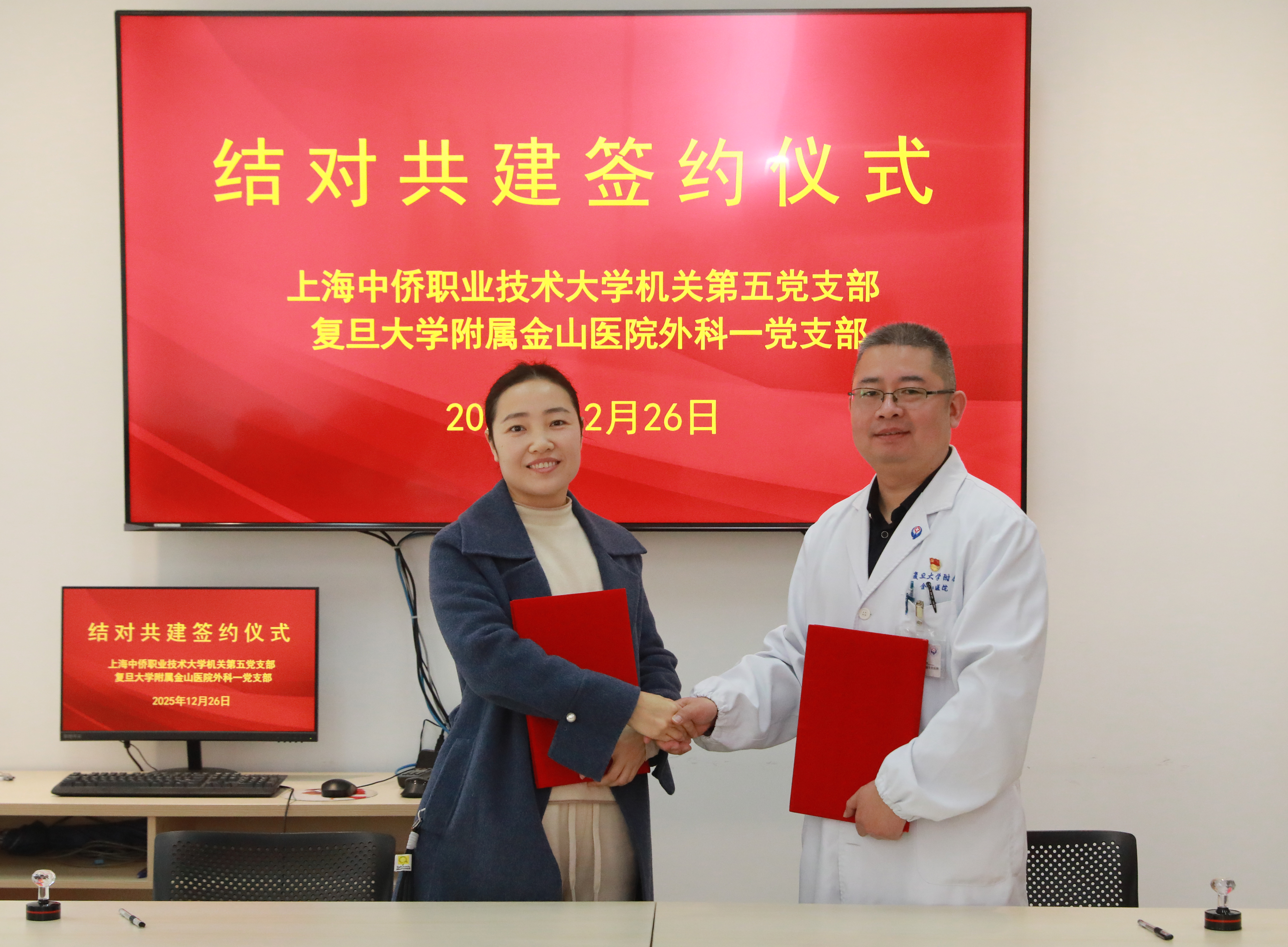 为推动党建与业务深度融合,2025年12月26日,金山医院外科一党支部与上海中侨职业技术大学机关第五党支部(基础教学部党支部)在金山区金山医院科教楼102室成功举行医教携手,同心向党结对共建活动。上海中侨职业技术大学党委副书记、纪委书记、学工部部长朱范鑫,金山医院党委书记、副院长张海涛出席活动并讲话。