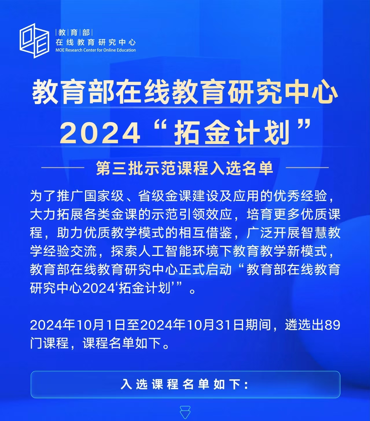 在信息化教育浪潮的推动下,为深化国家级、省级金课建设成果,促进优质教育资源的广泛共享与深度应用,教育部在线教育研究中心于近日正式宣布启动“2024‘拓金计划’”。此计划旨在通过推广金课建设的成功经验,强化示范引领,培育更多高质量课程,加速智慧教育的普及,并积极探索人工智能技术在教育教学中的新应用模式,为我国教育现代化注入强劲动力。