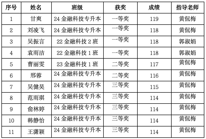 近日,备受瞩目的2024年同花顺杯全国大学生金融素养知识竞赛于2024年11月15日圆满落下帷幕。在此次竞赛中,我校经济与管理学院金融科技应用专业的学生们表现卓越,共有11个同学包揽了决赛的一二三等奖,展现出了扎实的专业知识功底和出色的团队协作能力,为学校争得了荣誉。比赛获奖同学名单及指导老师名单如下: