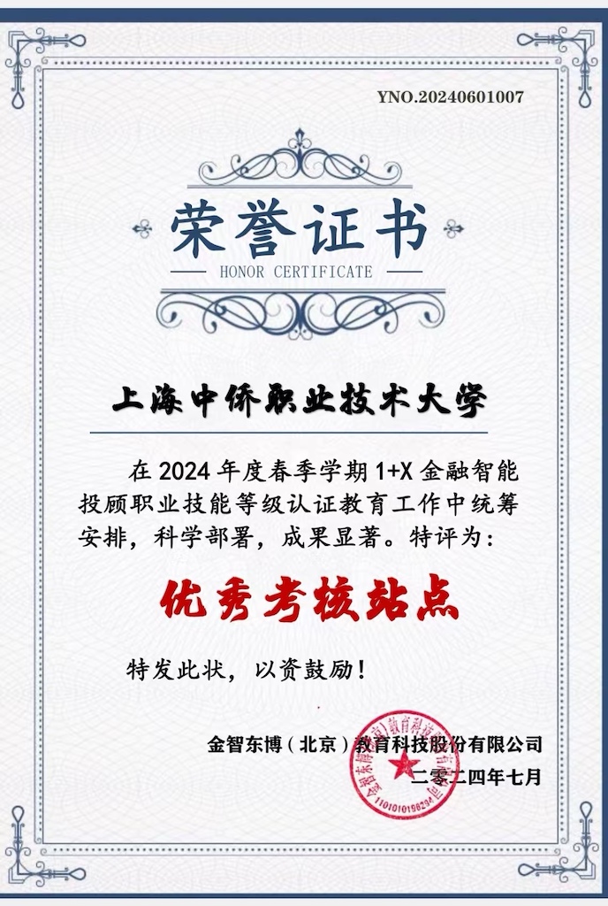 我校荣获2024年度1+X金融智能投顾职业技能等级认证 “优秀考核站点”荣誉称号